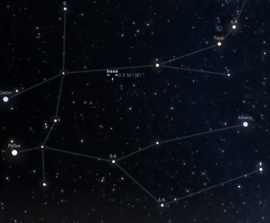 A hónap első oppozíciója tehát a tizennegyedikként felfedezett Irene kisbolygó szembenállása lesz. Az objektum az Ikrek csillagképben tartózkodik majd, mégpedig Castor „derekánál”. Mivel a Castor, illetve csillagtestvére, a Pollux igen fényes objektumai a téli égboltnak, és emellett a Téli Hatszög nevű aszterizmusnak is a részét képezik, viszonylag könnyedén megtalálhatjuk őket már a kora esti órákban. A 150 km-es átlagos átmérőjű Irene kisbolygó látszó fényessége 9,6 magnitúdó, amellyel a januárban szembenállásba kerülő kisbolygók közül a legfényesebb, ezzel azonban még mindig igencsak halványnak bizonyul ahhoz, hogy távcső nélkül is megpillanthassuk. A szembenállás pontos időpontja hajnali 4 óra 1 perc, de már előző nap kora este is teljesen ugyanolyan fényesnek látjuk, az az időpont talán könnyedebben vállalható egy kisbolygókeresésre.