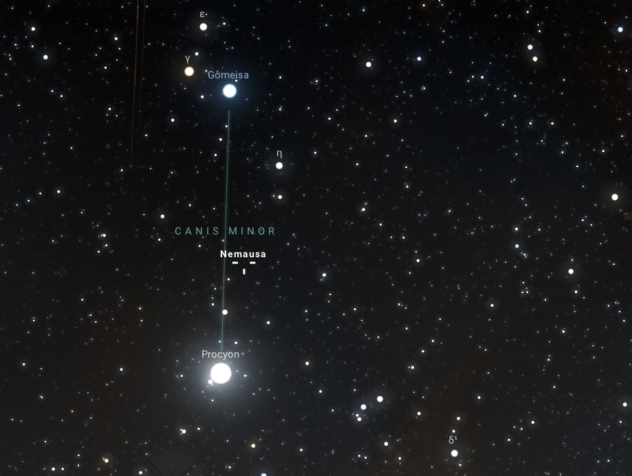 A harmadik és egyben utolsó januári oppozíció az ötvenegyedikként felfedezett Nemausa kisbolygóé. Az előző kis égitesttel szomszédos csillagképben, a Canis Minorban, azaz a Kis Kutyában látszik majd a szembenállása idején, tehát január 15-én 00:12-kor, ezt azonban kicsit könnyebben megtalálhatjuk, mint a rejtőzködő Eurynomét. A halvány, 10,7 magnitúdós látszó fényességű, 150 km-es átlagos átmérőjű Nemausa ugyanis a Kis Kutya csillagkép két jellegzetes, fényes csillaga, a Procyon és a Gomeisa között helyezkedik majd el. Az egész éjjel látszó kisbolygó felkeresését már a kora esti órákban is ajánljuk, de mivel a Mars bolygó hajnalban fényesen ragyog az égen, emiatt érdemes éjszakázni!