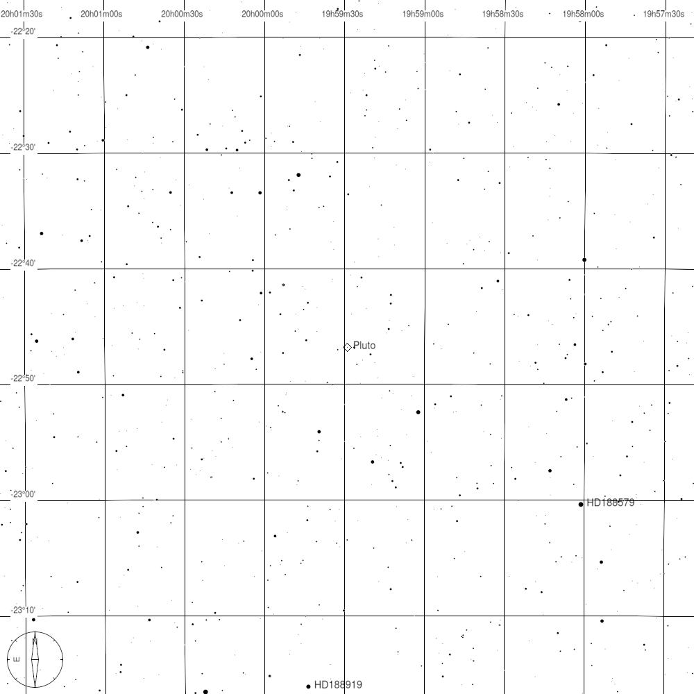 A törpebolygó oppozíciója július 20-án éjszaka figyelhető meg. Időpontja helyi idő szerint hajnali 3:33 óra. Ekkor 11° 31' magasan látható az égen a Sagittarius (Nyilas) csillagképben, nagyjából öklömnyire a horizont felett délnyugati irányban. Detektálására a legjobb időpont az éjszaka folyamán 0:51-kor adódik, ekkor tartózkodik legmagasabban, 20° 1'-cel, vagyis arasznyira a horizont felett pontosan déli irányban. A törpebolygó megtalálását néhány fényesebb égi objektum segíti, amelyek közül az egyik a szabad szemmel is látható csillag, az omega Sgr (4,7 magnitúdó), amelytől a Pluto 3° 30' távolságra található 8° irányban (észak). Az égboltot jól ismerők számára támpontot jelenthet a Messier 75 gömbhalmaz, tőle 2° 3'-re találjuk a Plutót 243° irányban (nyugat-délnyugat). A HD 189561 jelű csillag keresőtávcsövekben is jól látható (6 magnitúdó), a Pluto hozzá egész közel, mindössze 46' távolságra található 262° irányban (nyugat). A keresésben ugyancsak segítségünkre lehet a HD 188919. Jól látható keresőtávcsővel és binokulárral egyaránt (8 magnitúdó), a Pluto tőle alig fél fokra lesz (29') 353° (észak) irányban. Mindenképp érdemes sötét vidéki ég alatt észlelni a rendkívül halvány objektumot.