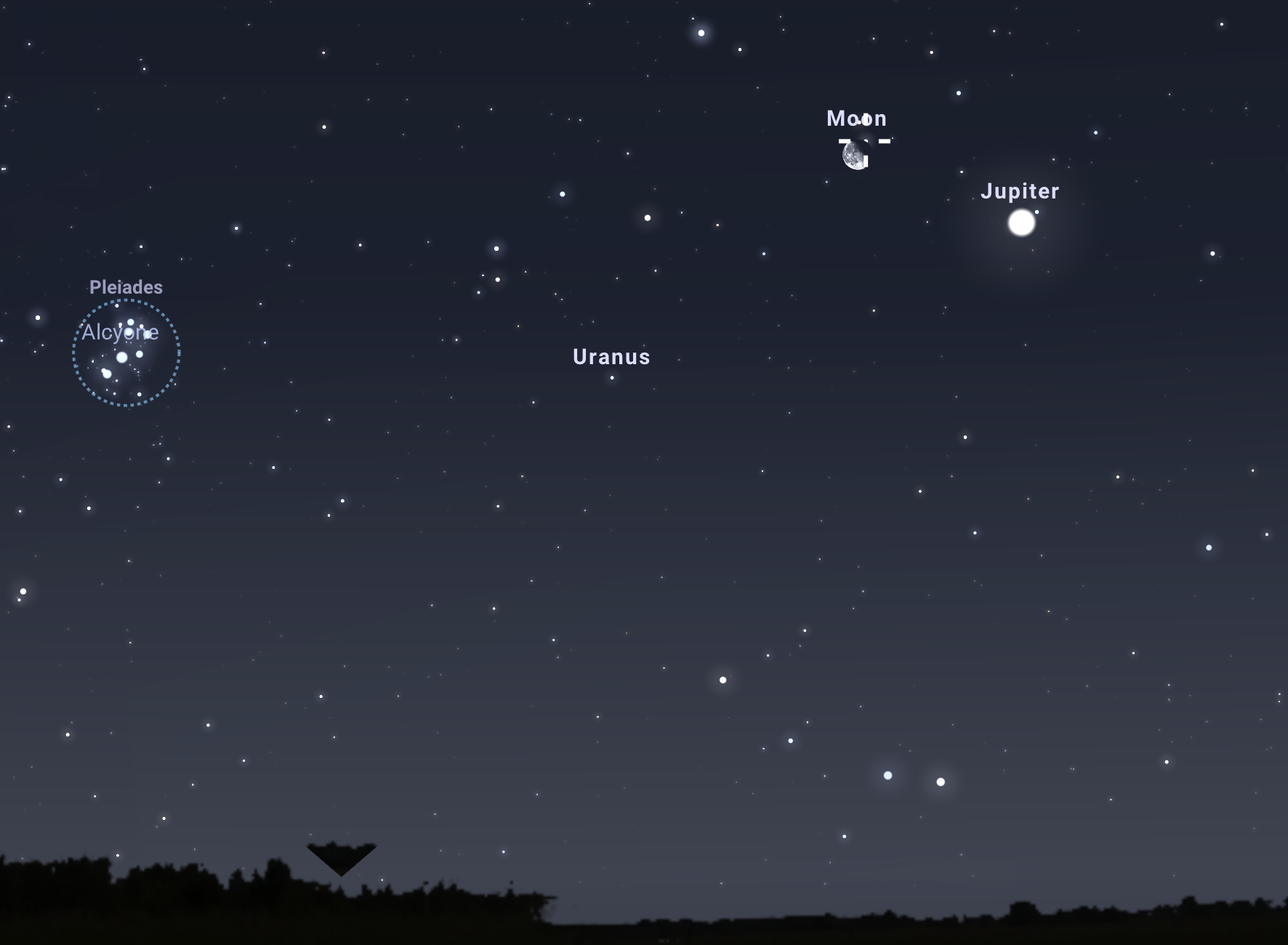 A 71%-os Hold ezen az estén 23:00 órakor három fokra közelíti a -2,7 magnitúdós fényességgel ragyogó Jupitert. Fantasztikus látványnak ígérkezik, már csak azért is, mert az M45 nyílthalmaz, közismert nevén a Fiastyúk is ott lesz tőlük 14 fokra.