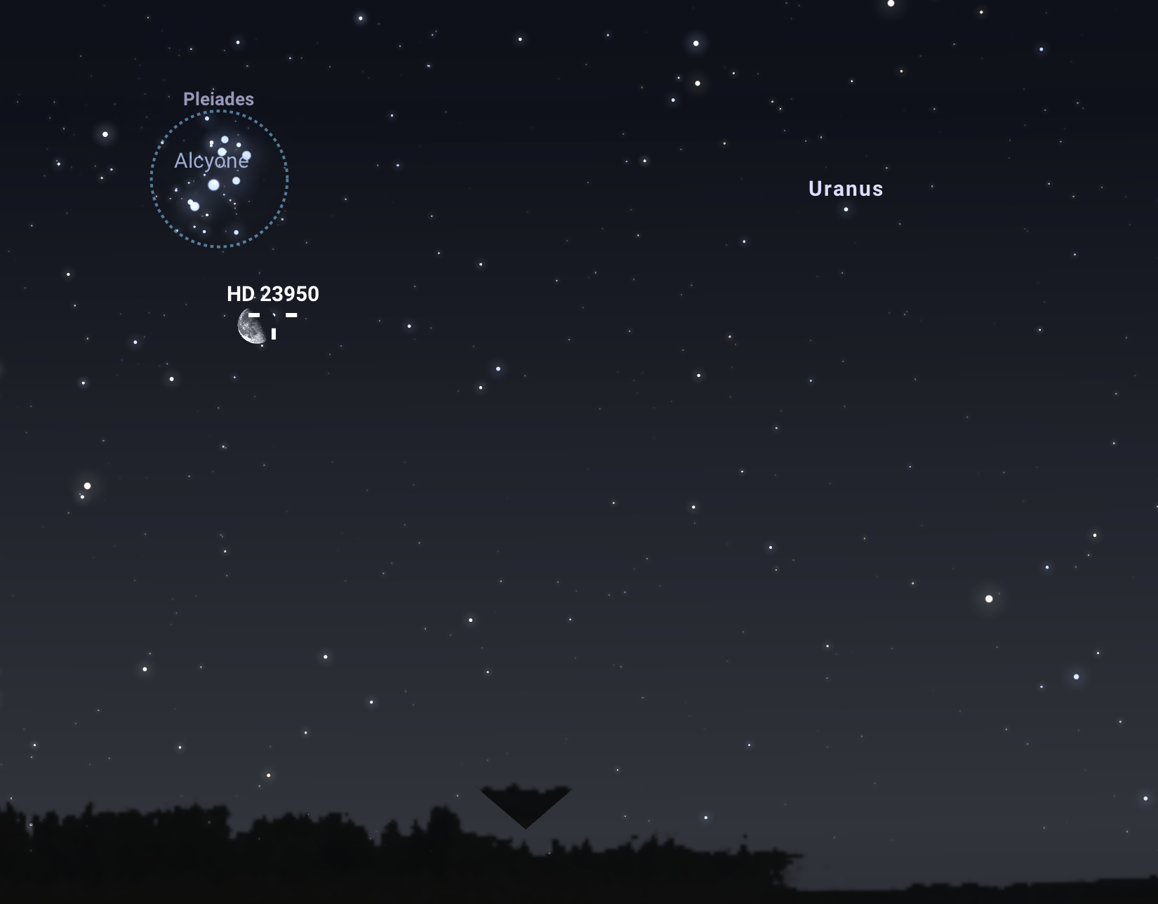 Ezt az együttállást is megelőzi egy csillagfedés, ezúttal 22:36-kor lép ki a Hold sötét oldalán a HD 23950 jelű, 6 magnitúdós csillag. Mindez a Fiastyúk alatt mindössze két fokkal – hálás fotótémának ígérkezik!