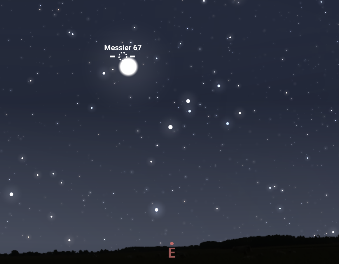 Érdemes lesz ezen a hajnalon korán felkelni, az augusztus 22-én egünkre visszatért, azóta egyre erősödő fényű Vénusz immár -4,4 magnitúdós, ragyogó fényességgel 48 ívmásodpercre közelíti az M67 jelű nyílthalmazt.