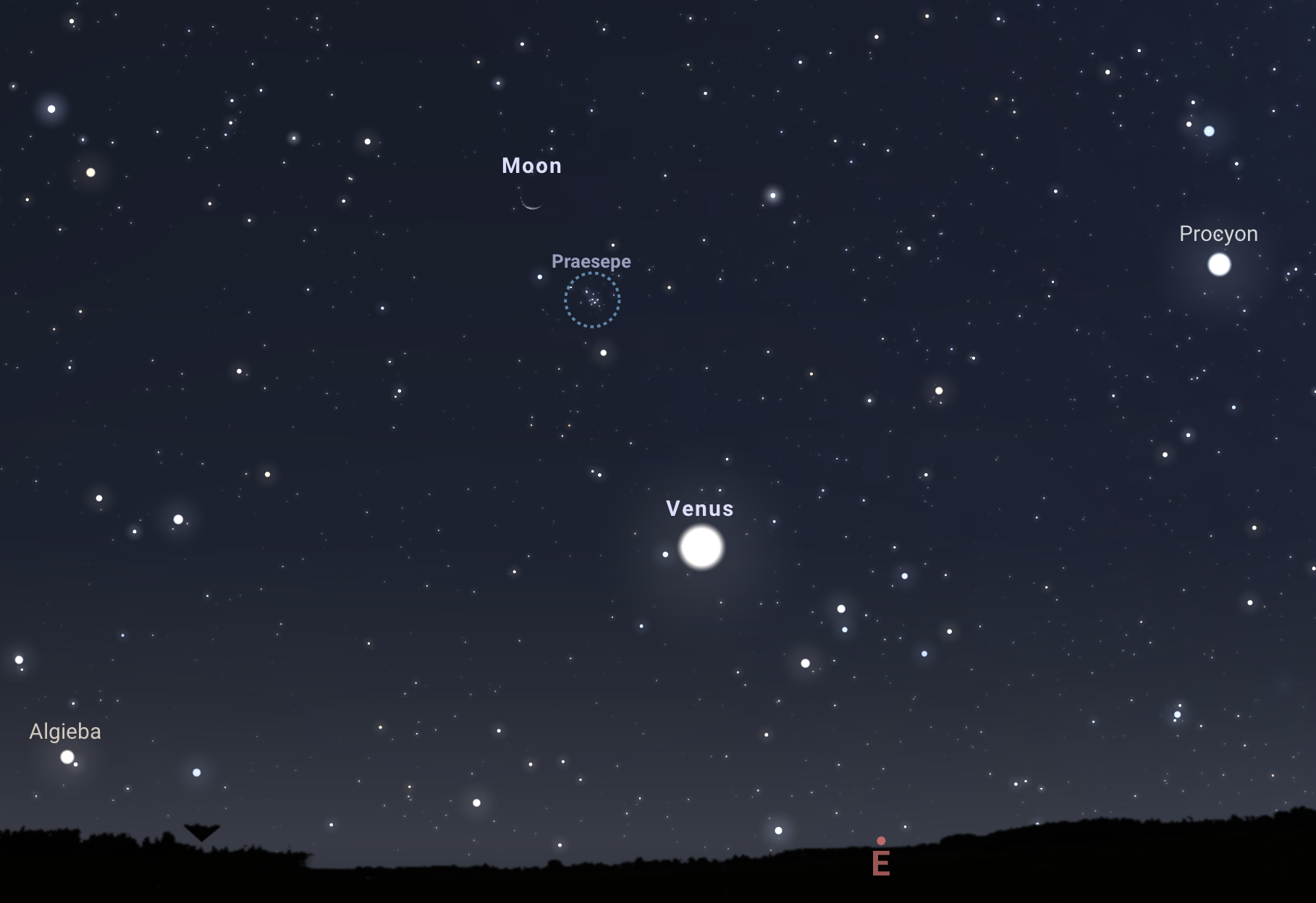 11-én a 13%-ra fogyott Hold 4 fokkal lesz északnyugatra az M44 nyílthalmaztól, azaz a Jászoltól (Praesepe), ami alatt további 9 fokkal a horizont felé ragyog majd a hajnali Vénusz.