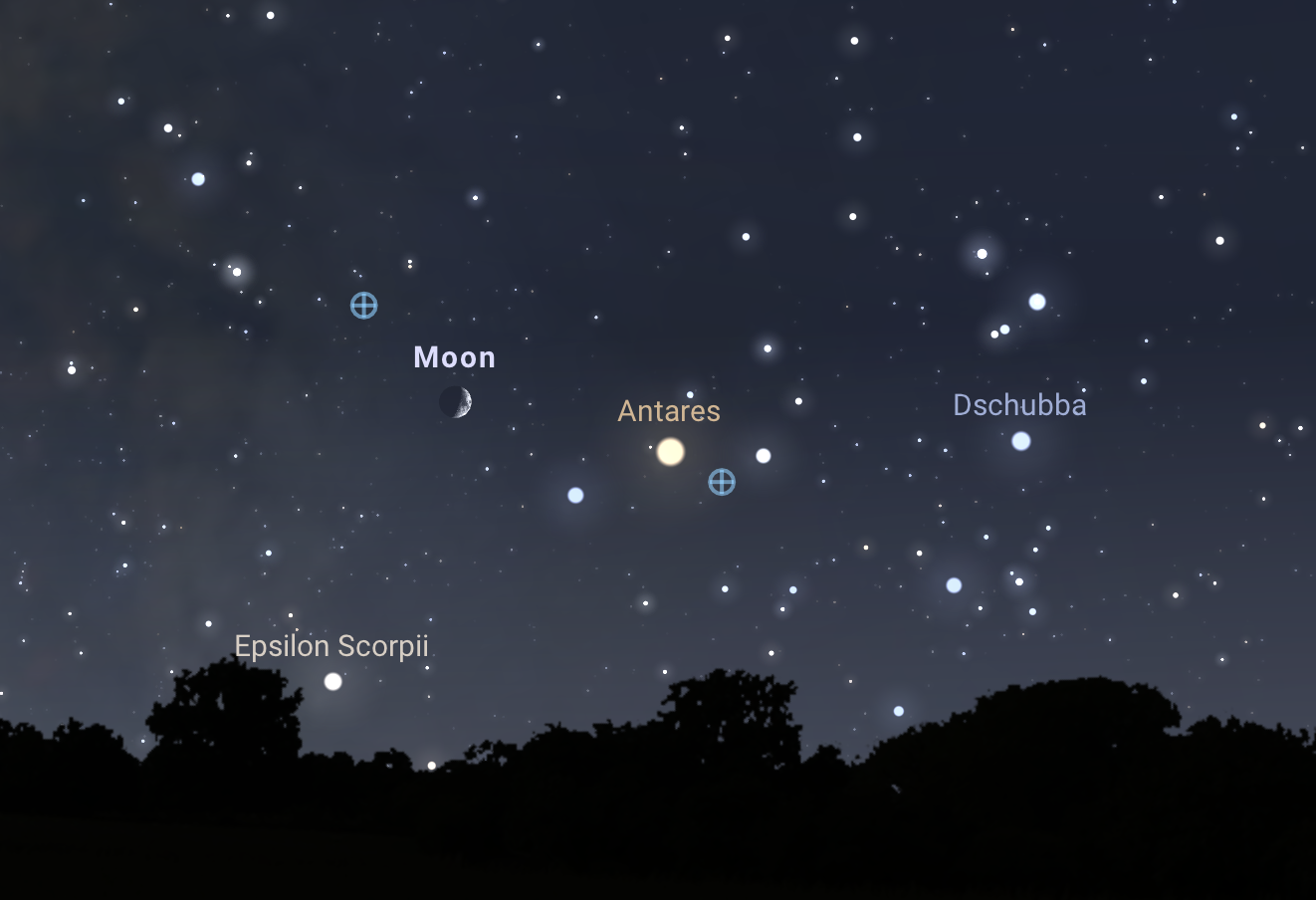 Mielőtt a nyári Tejút eltűnne egünkről, a 28%-os fázisban levő holdsarló még benéz a Skorpió csillagképbe, és együttáll annak legfényesebb csillagával, az Antaresszel.