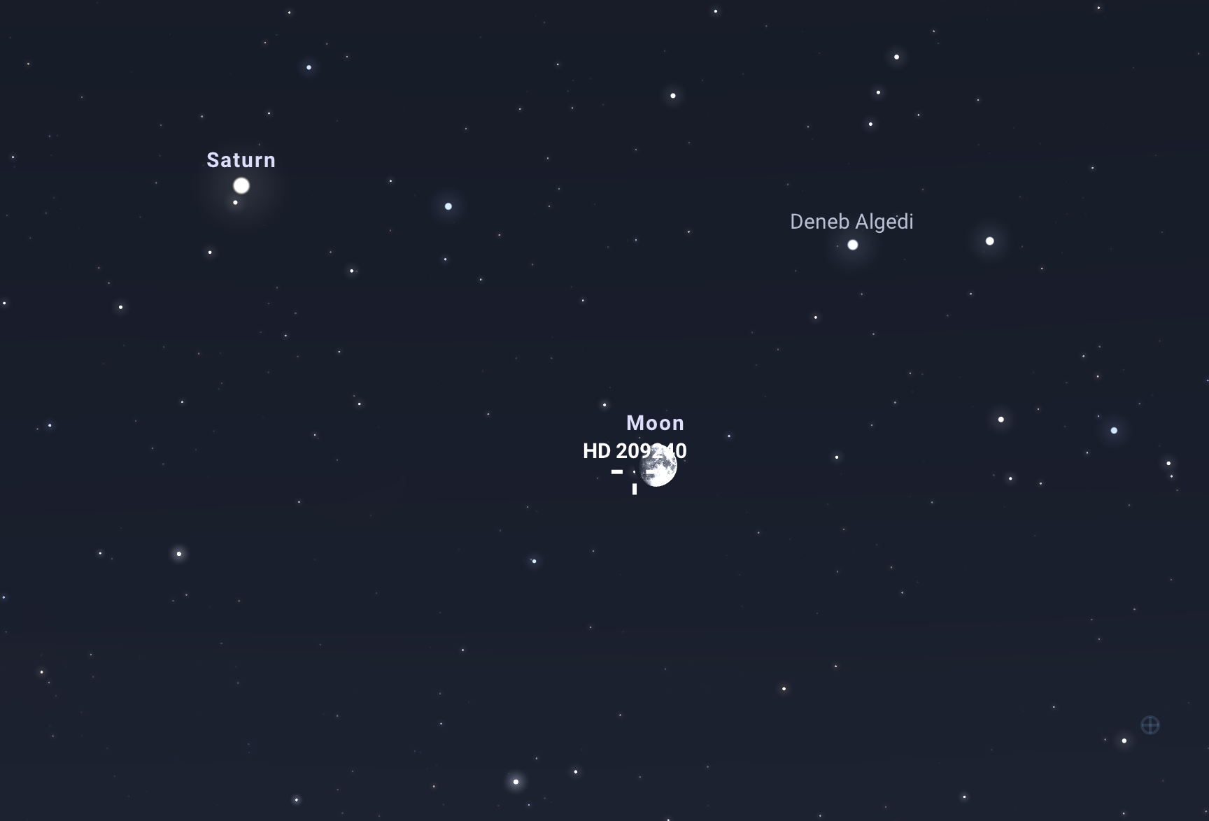 A szeptemberi Hold-jelenségeknek sincs még vége, 26-án 20:34-kor a HD 209240 jelű csillag lép be kísérőnk sötét oldalán, éjfél után pedig bő öt fokra közelíti meg a Hold a Szaturnuszt a Vízöntő csillagképben.