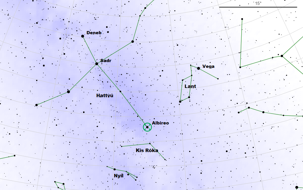 Egyik megfigyelni ajánlott égitestünk, a már nevén nevezett csillag, az Albireo. Pontosabban itt nem is egy csillagról van szó, hanem kettőről, amelyek kb. 100.000 év alatt kerülik meg egymást. A kettős tagjai közötti szeparáció 34”, fényességük pedig 3,1, illetve 5,1 magnitúdó. Ezen paraméterekkel akár az „átlagos” (ha egyáltalán lehet ilyet mondani) kettőscsillagok kategóriájába sorolhatnánk párosunkat „De hát akkor miért is szerepel ebben a cikkben? Biztos van valami turpisság a dologban!” – gondolhatja olvasónk. És ez milyen igaz! A kb. 400 fényév távolságban lévő csillagok hőmérséklete ugyanis nagyon különböző. A fényesebbik tag kb. 4.000 C°-os, a halványabbik pedig 13.000 C°-os. Ez azt jelenti, hogy színük nagymértékben eltér egymástól.