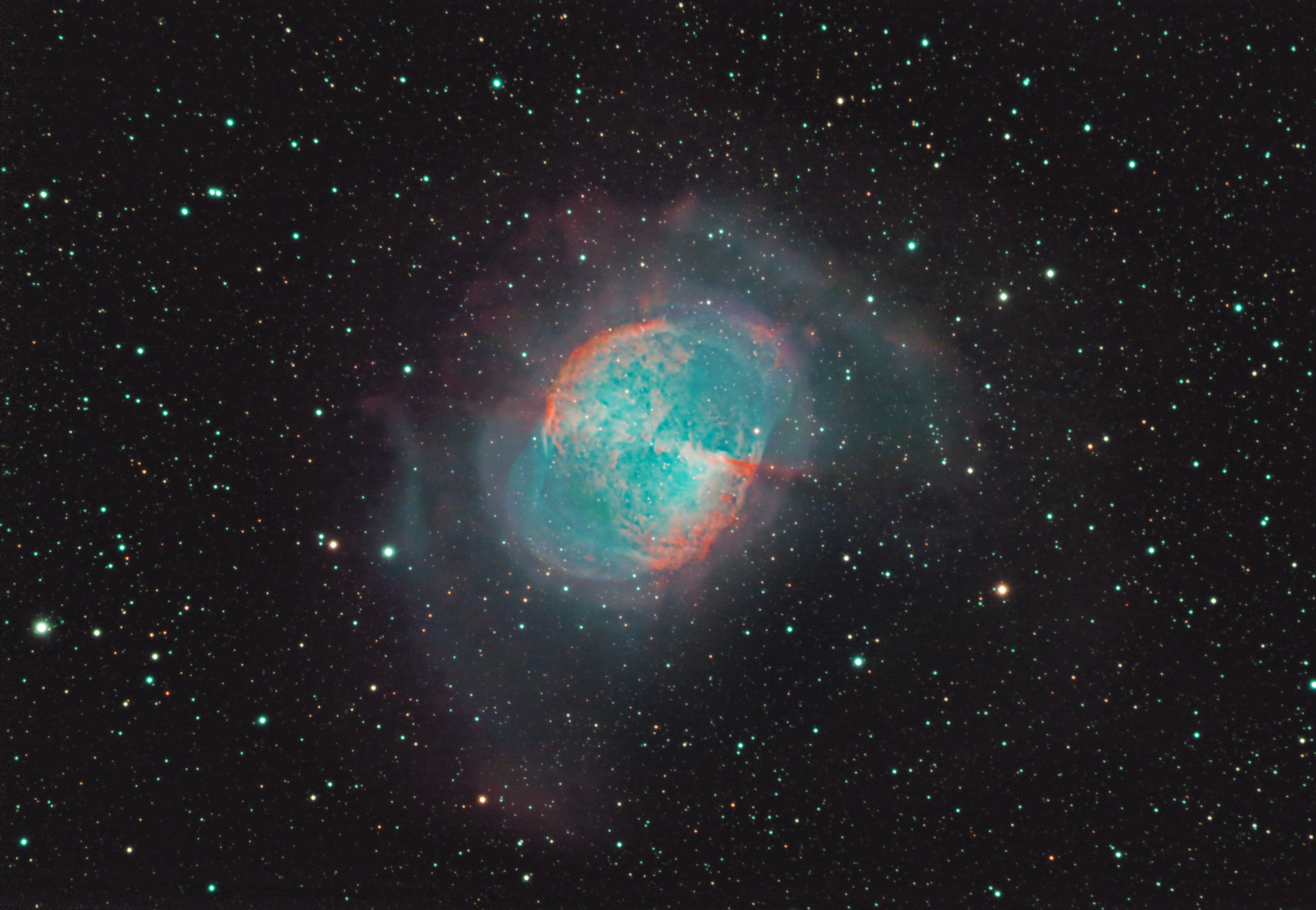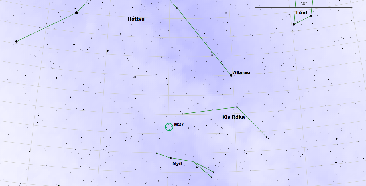 A másik szeptemberi objektumunk az M27 katalógusnevű, gyönyörűséges planetáris köd. Ez egy kb. 4000 éve kihunyt csillag maradványa. A közepes méretű csillag haláltusája alatt külső gázrétegeit ledobta, amelyből kialakult, jelenleg is táguló felhőt figyelhetjük meg (a tágulás sebessége megdöbbentő: néhányszor tíz km/s nagyságrendjébe esik). A megfigyeléshez azonban valamilyen fényt kell kibocsátania. Ennek a magyarázata sem bonyolult. Az eredeti csillag maradék magja egy fehér törpecsillaggá vált, amelynek felszíni hőmérséklete nagyjából 120.000 C°. Ez azt jelenti, hogy (emlékezzünk vissza az előző alfejezetre) a törpecsillag rendkívül erősen fog sugározni ultraibolyában. Ez a nagyenergiás sugárzás pedig gerjeszteni képes a gázfelhőt (ennek a fizikájába most nem szeretnék belemenni, talán majd máskor), és a felhő így számunkra is látható fényt bocsát ki.