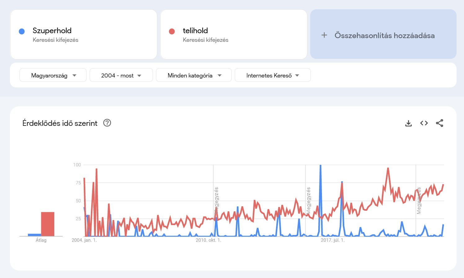 A Google keresési statisztikája szerint a telihold kifejezésre lassan, de folyamatosan egyre többen keresnek rá, míg a szuperhold egy 2017-es csúcsot leszámítva fokozatosan elmarad tőle.