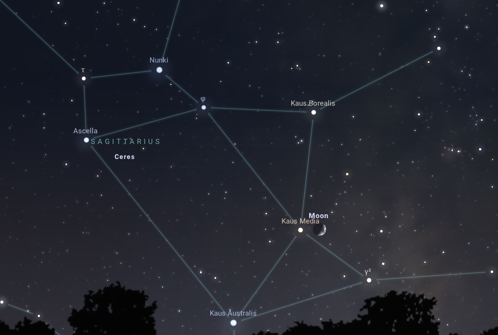 Október 9-e szerdája is érdekes Holdas együttállással kecsegtet: ezúttal az égi sarló a Nyilas csillagképbe vándorol, és igen közel kerül annak Kaus Media nevű csillagához. A két égitest közelségét már este 7 órakor is megfigyelhetjük, amikor még a horizont felett 10 fokos magasságban látszik majd a konstelláció a navigációs szürkület végén. Az együttállás legkedvezőbb pillanata kicsit később, este 20:30-kor következik majd be, viszont ekkorra már jóval alacsonyabbra süllyed a nyugati horizont felé a duó, ami kicsit körülményesebbé teszi a megfigyelést. Ha az előző napokban borult idő volt, avagy valami miatt véletlenül lemaradtunk volna az előző két Holdas együttállásról, ezt mindenképpen érdemes megnézni. A Nyilas csillagkép teáskannája ugyanis önmagában véve is egy jellegzetes és megfigyelésre méltó alakzat, ha pedig a Hold is benne van, könnyedén megtalálhatjuk.