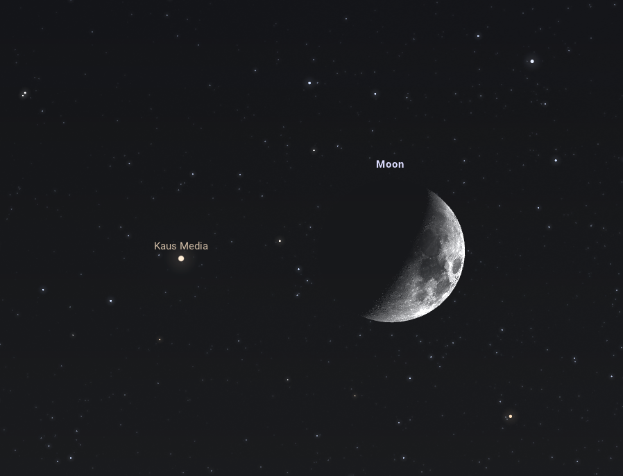 Az együttállás legkedvezőbb pillanatában a Hold mindössze 29'-re lesz majd a Kaus Mediától, a horizont felett 5 fokkal, este 20:30-kor. Ezt az időpontot azonban nem muszáj megvárnunk, másfél órával korábban szintén igen látványos lesz a két égitest közelsége (egy kicsit távolabb lesznek egymástól), s ekkor még a horizont felett 10 fokkal fog látszani, ami lényegesen megkönnyíti az észlelést.