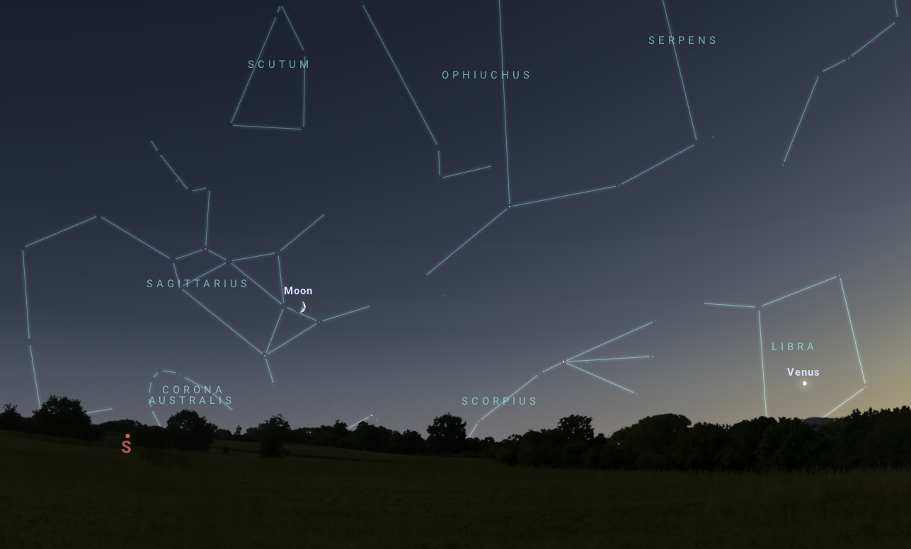 Az október 9-i napon, ha szerencsések vagyunk, és derült lesz az idő, a naplemente utáni időszak számos gyönyörűséggel kecsegtet. Ha megvártuk, hogy lemenjen a Nap, a nyugati égbolton felsejlik a Vénusz, vagy ahogy a köznyelv ismeri, Esthajnalcsillag. Horizonthoz közeli, fényes pontja minden más csillaggal, illetve bolygóval összekeverhetetlen, így jó kiindulási alapot szolgáltat minden észlelőnek. A Vénusztól balra látszik majd, szintén a horizont közelében a Skorpió csillagkép legyezője, közepén az Antares vöröses ékkövével, majd mindezektől még egy kicsit balra, a déli égbolt irányában kap helyet a Nyilas csillagkép és annak jellegzetes, teáskannát formázó aszterizmusa. A teáskanna belsejében lesz majd a Hold, mégpedig a 2,7 magnitúdós, Kaus Media (Kaus Meridionalis) elnevezésű csillag közelségében.
