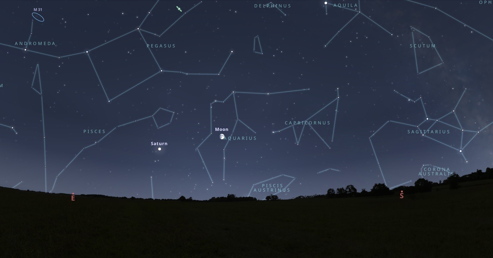 Egész éjszaka végigkísér minket a Hold, valamikor naplemente környékén, 19 óra körül már feltűnik a horizonton, és méltóságteljesen emelkedik majd. Sötétedés után, 20 óra körül már jól látszik a 91%-os, növekvő fázisú égitest. A délkeleti égen lesz látható, a Vízöntő csillagképben, körülbelül 23 fokra a horizonttól.