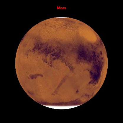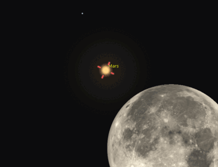 A Mars, nagy nagyításon, 2022.12.08-án, 6:06 perckor, a belépés előtt. Jól látszik, hogy a bolygó épp az északi pólusával ront a Holdnak, a keleten kelő Syrtis major fölfelé látszik. Balra lent a Hold sötét foltja a Grimaldi kráter. Forrás: Stellarium online.