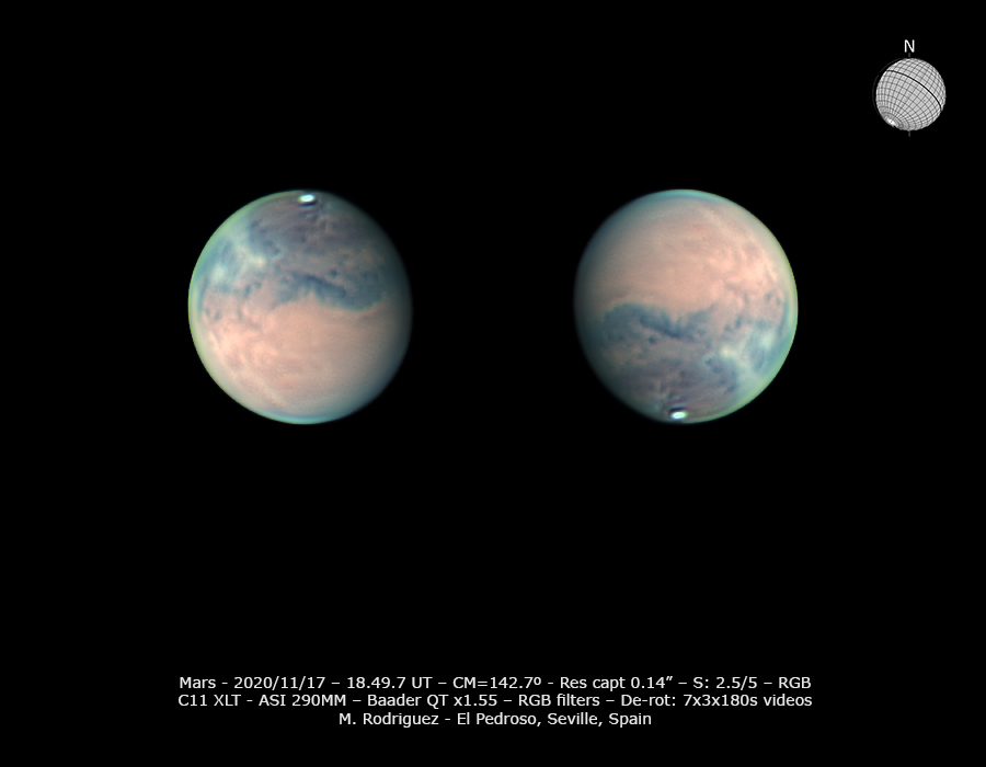 📸 Borítókép: A Solis Lacus fölött kitört két új vihar gócpont, és a belőle származó, balra fölfelé elhúzódó, több ezer kilométeres porsáv M. Rodriguez felvételén, 2020.11.17 18:49 UT-kor. Forrás: ALPO Japan