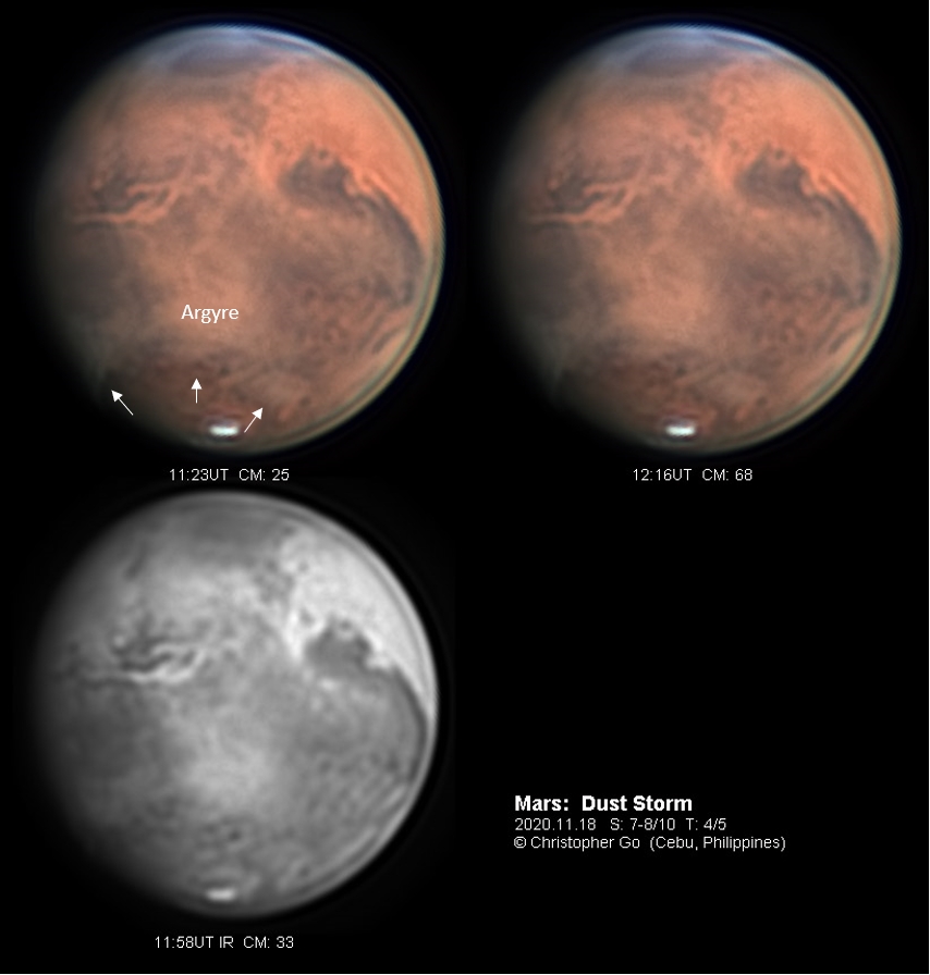 Christopher Go fotóján pedig láthatjuk, ahogy a magasabb légkörben a porfelhő egészen az Argyre medencéjén túlra hatol, és egészen délre, a Depressiones Hellesponticae területéig felnyúlik.
