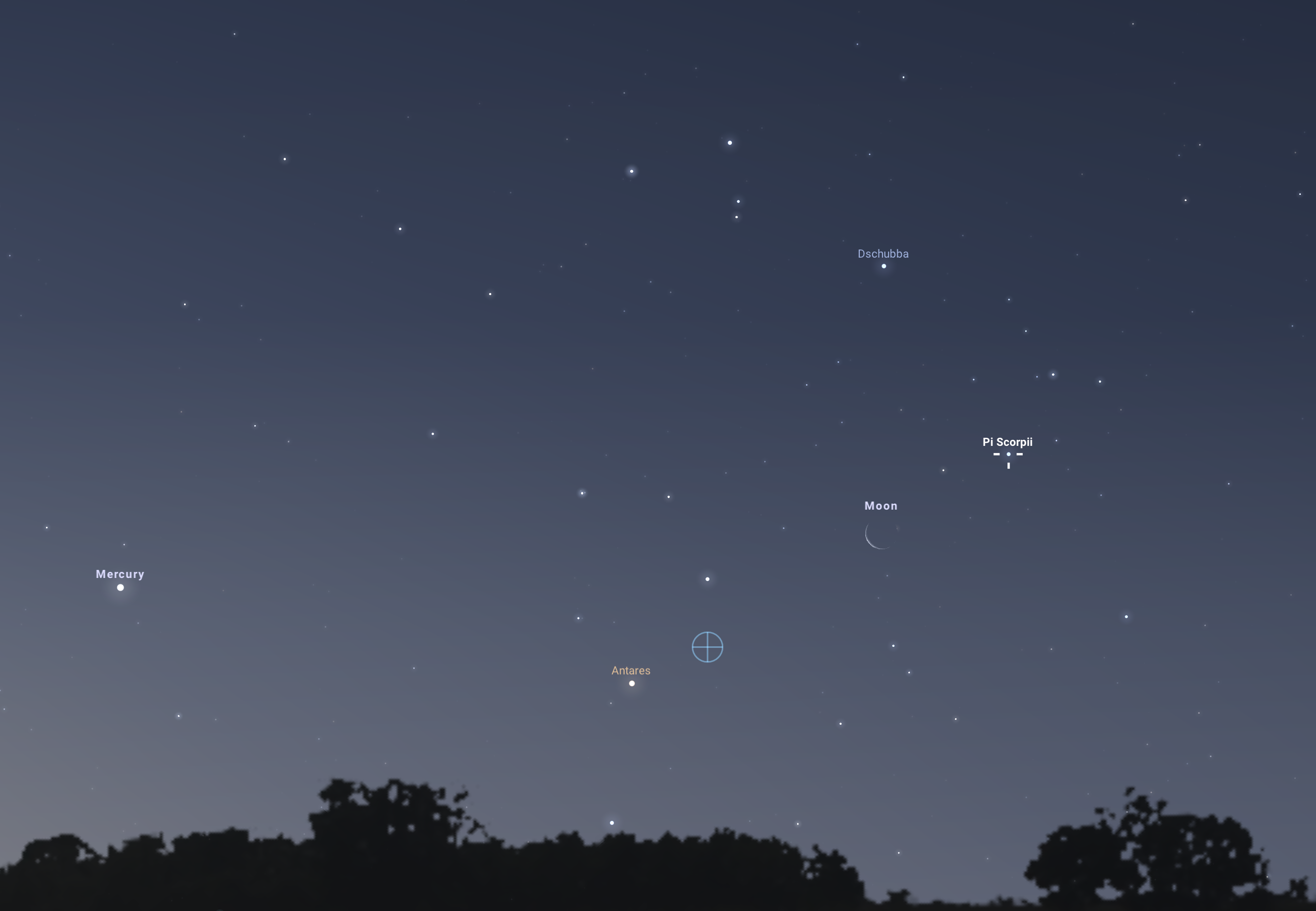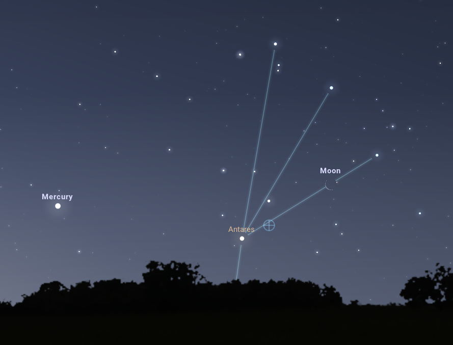 A holdsarlótól balra, 11,5 fokkal, vele közel azonos magasságban látszik a Merkúr -0,3 magnitúdós, tehát az Antaresnél némileg fényesebb fénypöttye. Ekkorra a Naprendszer legkisebb bolygója már a dichotómiája utáni, dagadó fázisában pompázik majd, megfigyelése pedig érdekes lehet egy binokulárral is, de a kicsiny, 6,2”-es korongmérete miatt a fázisát csak közepes nagyítású távcsőben láthatjuk majd. Ugyanez természetesen elmondható a Hold sarlójáról is, amelyet mind binokulárban, mind távcsővel érdemes megnézni.