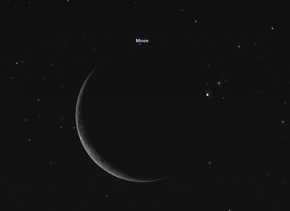 Az Antares mellett 4,2 fokkal jobbra fentebb látszik majd a Hold szinte papírvékonyságú, 8%-os fázisú sarlója, amelynek megtalálása kisebb kihívást jelenthet. Az azonban némileg egyszerűsíti a dolgunkat, hogy égi kísérőnk éppen a legyező legalsó vonalán, tehát az Antarest a Pi Scorpiival összekötő egyenesen fog elhelyezkedni, így bujkáló alakját még a kevésbé tapasztaltak is hamarosan megtalálják.