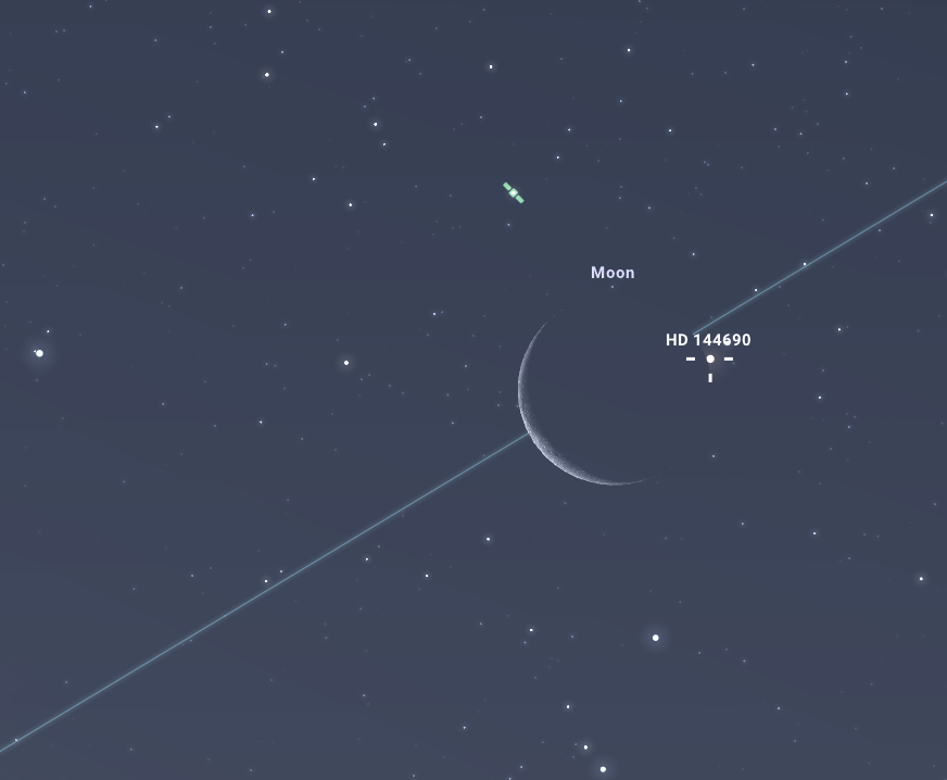 Ha még mindez nem lenne elég, az együttállással szinte egy időben, 6:32-kor egy csillagfedés végső állomását is megfigyelhetjük: a HD 144690 nevű, 5,4 magnitúdós látszó fényességű csillag ugyanis ekkor lép ki a sarló mögül a sötét oldalon. Sajnos a belépést nem tudjuk megfigyelni, hiszen akkor a Hold még szinte érinti a horizontot. Ez azonban a hónap utolsó ajánlott csillagfedése, így aki vette a fáradságot ahhoz, hogy kimenjen az együttállás megtekintésére, próbálkozzon meg a kilépés megfigyelésével is. Ez azonban mindenképpen binokulárt vagy távcsövet kíván az élmény teljességének eléréséhez.