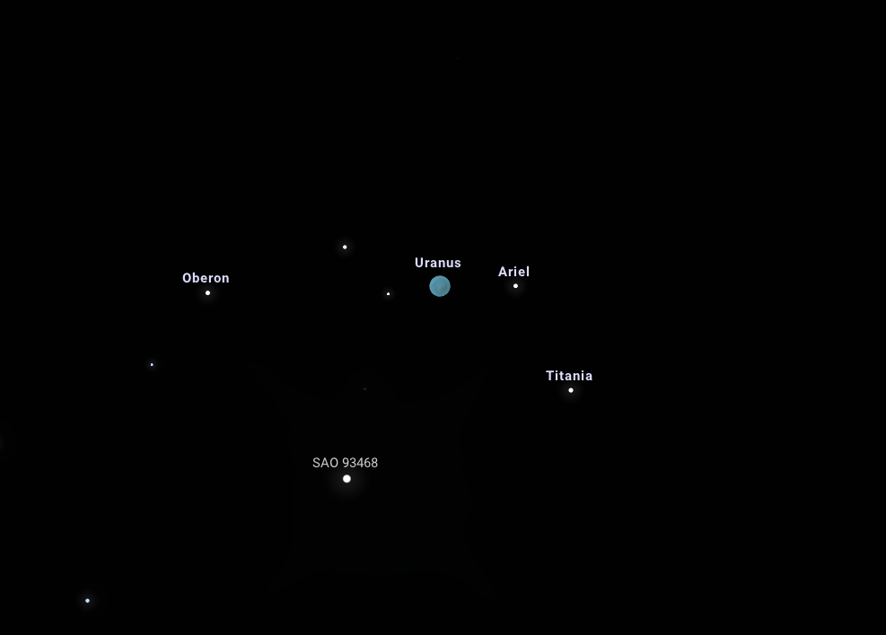Este 20:42-kor pedig az Uránusz mellett látszik majd a 8,1 magnitúdós látszó fényességű SAO 93468 jelölésű csillag, mégpedig a bolygótól mindössze 37"-re, amely távolság egyenlő az Uránusz korongátmérőjének 11-szeresével. A páros egy látómezőbe belefér, kellően meg is nagyítható a látvány, így észlelése rendkívüli élménnyel járulhat hozzá ehhez a szép, tavaszi kora estéhez.