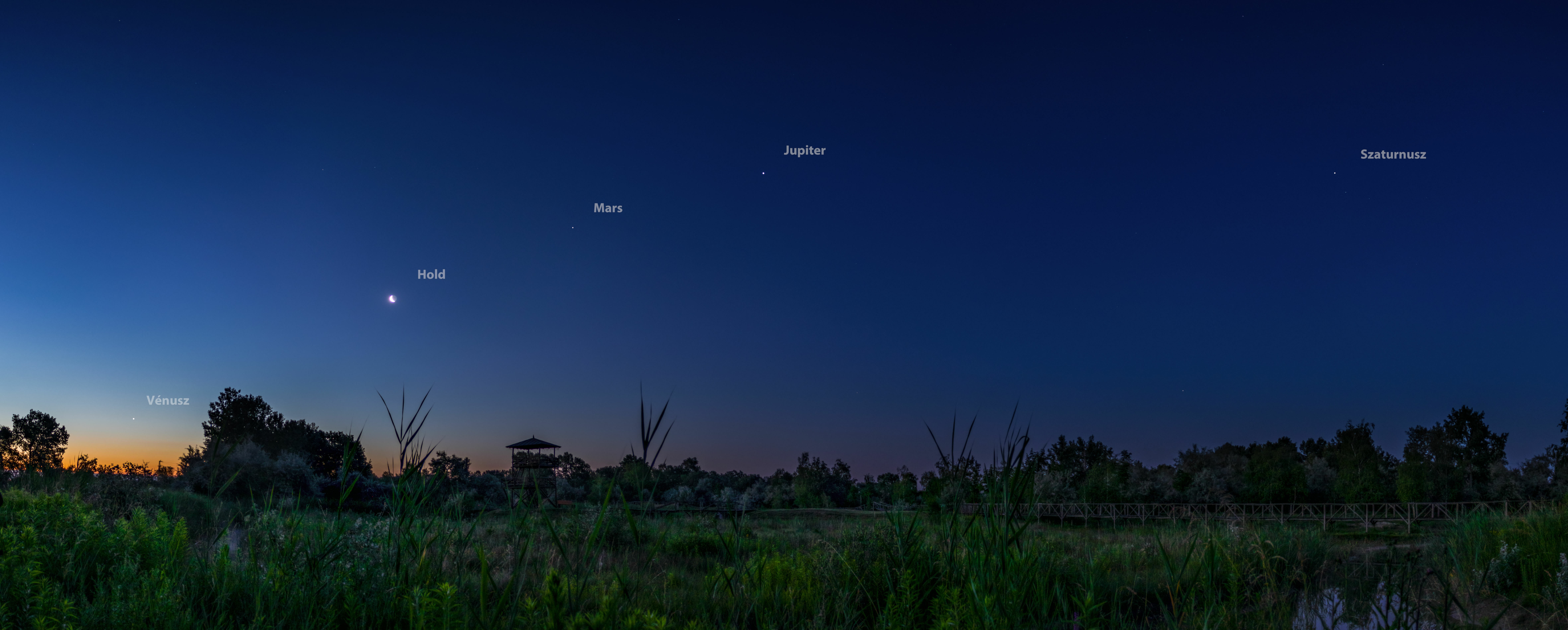 A sétány egyik hátsó útján sikerült jó helyet találnom, ahonnan a Vénusz a fák között kelt és a Hold a többi bolygóval együtt a kilátó és a sétány fahídjai felett látszódtak. A kisebb tavak víztükrét a nádas eltakarta, de a képen mégis látható egy pici vízfelszín.