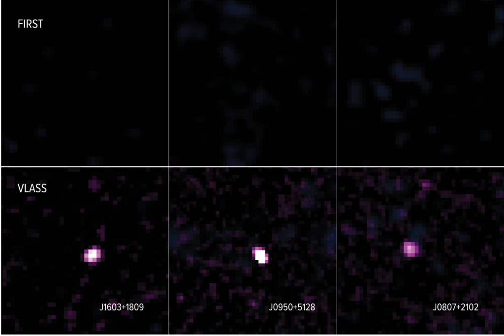 A VLASS a becslések szerint 10 millió egyedi rádióforrást katalogizál majd.Egy amerikai kutatócsoport az első körben kapott VLASS eredményeket hasonlította össze a korábbi FIRST felmérés katalógusával. Az égi rádióforrások „szénakazlában” olyan „tűket” kerestek, amelyek újonnan felfénylő aktív galaxismagoknak felelnének meg.