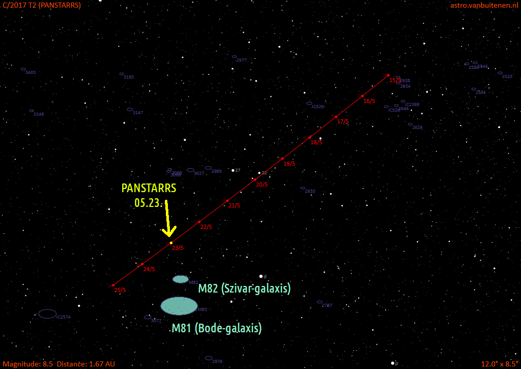Most, május 23-án a PanSTARRS üstökös 52 ívpercre közelíti meg a Szivar-galaxist. Ez azt jelenti, hogy alig nagyobb távolságra lesz majd tőle, mint a Bode-galaxis és fényességük is nagyon hasonló lesz.