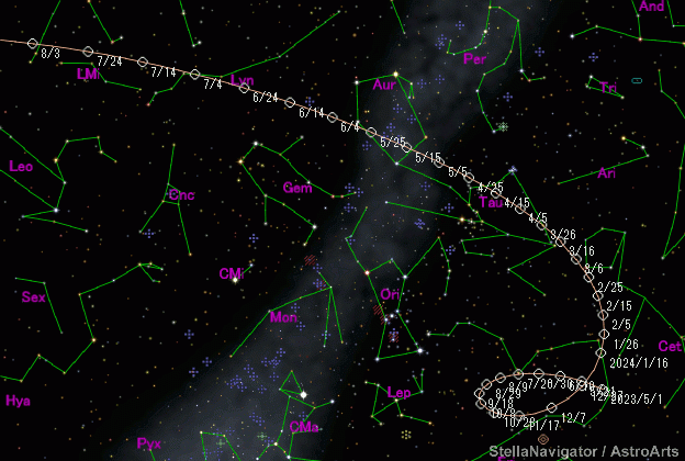 Mivel látszó fényessége június 23-án körülbelül 7,5 magnitúdó lesz, megfigyelése mindenképpen távcsőért kiált, abban azonban viszonylag könnyedén észrevesszük majd. Mindenkit bátorítunk tehát arra, hogy ha egy nyári éjszakán a csillagos égboltra veti tekintetét, keresse meg a horizont közelében a kevésbé ismert Hiúz csillagképet és a benne megjelenő különleges égi vándort!