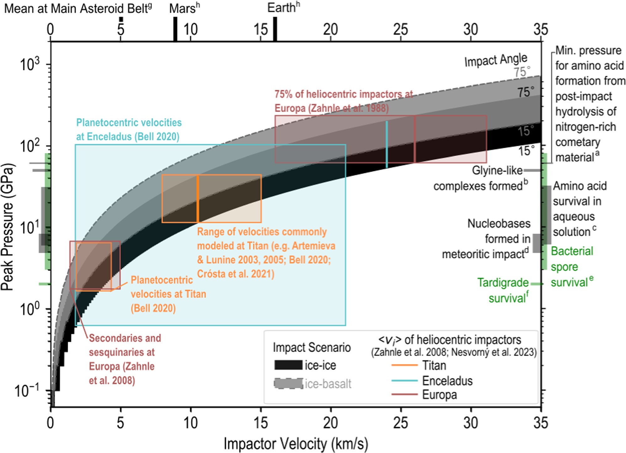 Korábbi tanulmányok az óceánholdak krátereinek méreteiből határozták meg a becsapódások sebességét és nyomását, amit a fenti ábrán színes téglalapokkal jelezve látunk. Több más kutatásban megbecsülték a bióták és a biológiailag fontos molekulák számára túlélhető nyomástartományt, amelyeket a grafikon jobb oldalán lévő zöld és fekete sávok mutatnak. Látszik, hogy a túlélhető nyomástartományok a becsapódások megfigyelt és modellezett nyomásaival megegyeznek. Tehát az életnek ezek az építőkövei lerakódhatnak és valószínűleg le is rakódtak az óceánholdakon.