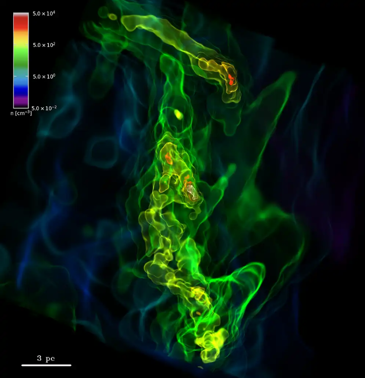 Ke-Jung Chen (Academia Sinica, Tajvan) és munkatársai szerint ennél bonyolultabb a helyzet. Részletes számítógépes szimulációkkal felfedték, hogy az összeomló gázfelhőkben szuperszonikus turbulenciák alakultak ki: a gáz bennük a hangsebesség ötszörösével mozgott. Az így keletkezett lökéshullámok a nagyobb felhőket feldarabolták, és segítettek a gravitációnak legyőzni a gáznyomást.