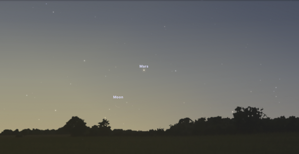 A megfigyelést tovább nehezíti, hogy a Mars és a Hold nagyon alacsonyan, pár fokkal lesznek csupán a látóhatár felett (6, illetve 3 fokkal), így csakis teljesen tiszta délkeleti horizonttal rendelkező észlelőhelyről érdemes próbálkoznunk a feladattal.