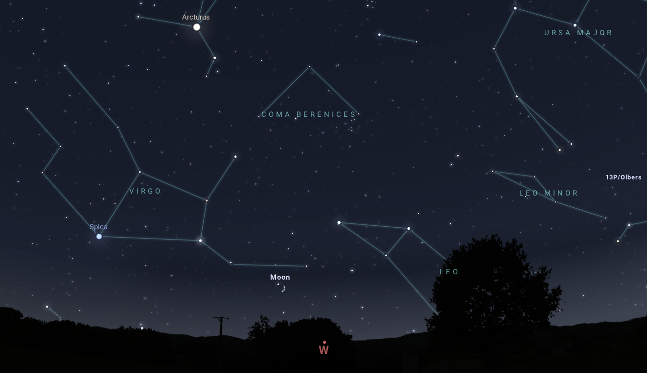 A Hold mellett balra megszemlélhetjük a Szűz csillagkép jellegzetes négyszögalakzatát is, amelynek bal csúcsánál található a Spica, a Szűz csillagkép legfényesebb csillaga. A Holdtól jobbra egy másik állatövi csillagkép, az Oroszlán is még épp kidugja orrát a horizont alól, mivel azonban igen alacsonyan lesz, a csillagképet nehezen lehet majd teljes egészében megfigyelni.