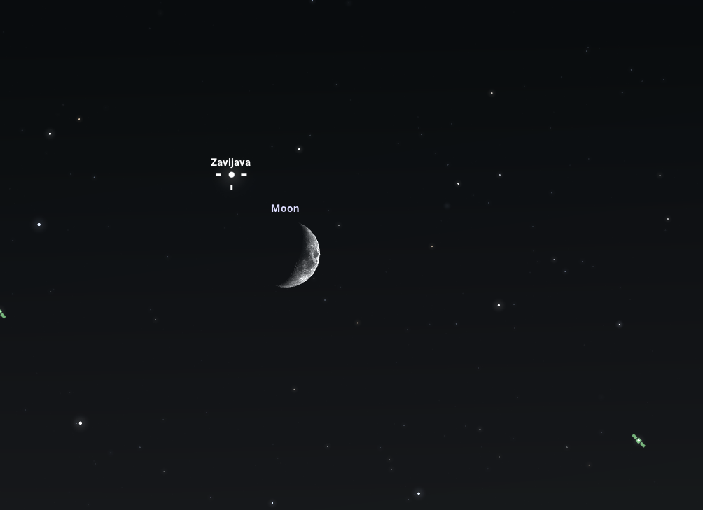 Ezúttal, július 11. napján, csütörtökön a Szűz csillagkép béta görög betűvel jelölt csillaga, amely a Zavijava nevet is viseli, kitüntetett pozícióba, mégpedig Holdunk közelségébe kerül, attól balra fentebb lesz látható. Az egyre markánsabbá váló, D alakot formázó Hold és a 3,6 magnitúdós, tehát holdfénymentes éjjel szabad szemmel is kiválóan látható csillag szoros együttállását még az is megfigyelheti, aki nem szeret éjszaka közepén felkelni, avagy olyan sokáig fennmaradni. Az együttállást legkedvezőbben 22:19-kor lehet majd megfigyelni a már sötét nyugati égbolton a navigációs szürkület végén. Mindenkit bátorítunk erre a szépséges szabad szemes észlelésre, és aki még egy binokulárt is magával visz, közelebbről is megfigyelheti a Hold mesés krátereit.