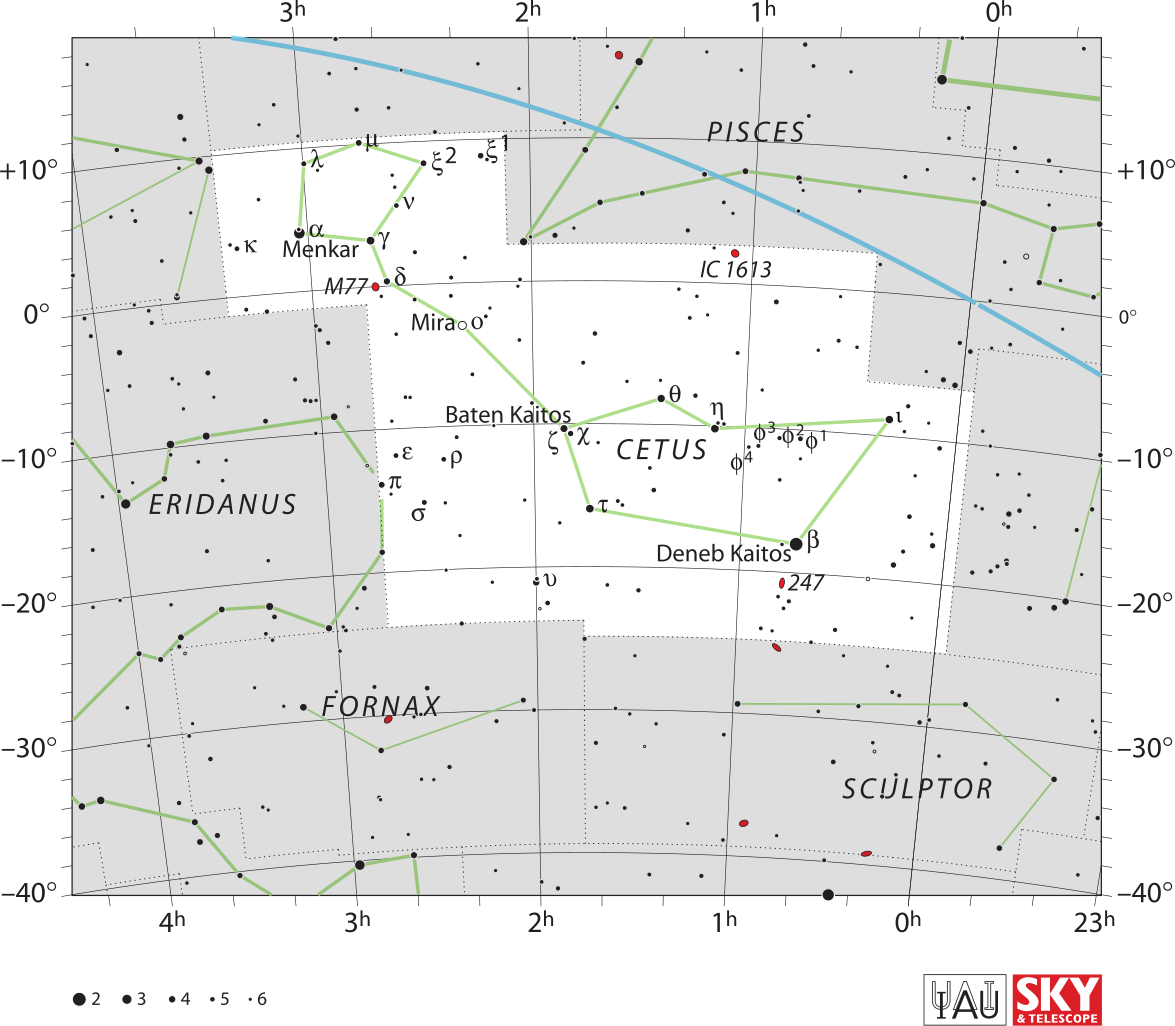 - ο (omikron) Ceti (Mira): kettőscsillag, amely egy változó óriáscsillagból (Mira A) és egy fehér törpéből (Mira B) áll. A Mira név jelentése „csodálatos”. A Mira A egy pulzáló változócsillag, a mira-változók prototípusa. Kb. 418 fényévre van tőlünk, maximális fényessége 3 magnitúdó körüli. Ezen típusú változók mind vörös óriások, amelyek fényessége 80 és 1000 nap közötti periódussal növekszik és csökken. A Mira minimális fényessége pedig 10,1 – ilyenkor láthatatlanná válik szabad szemmel.