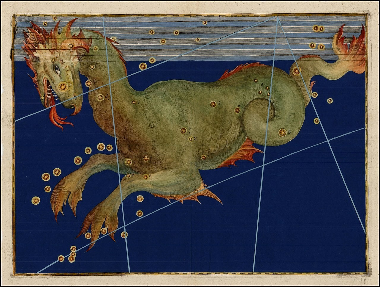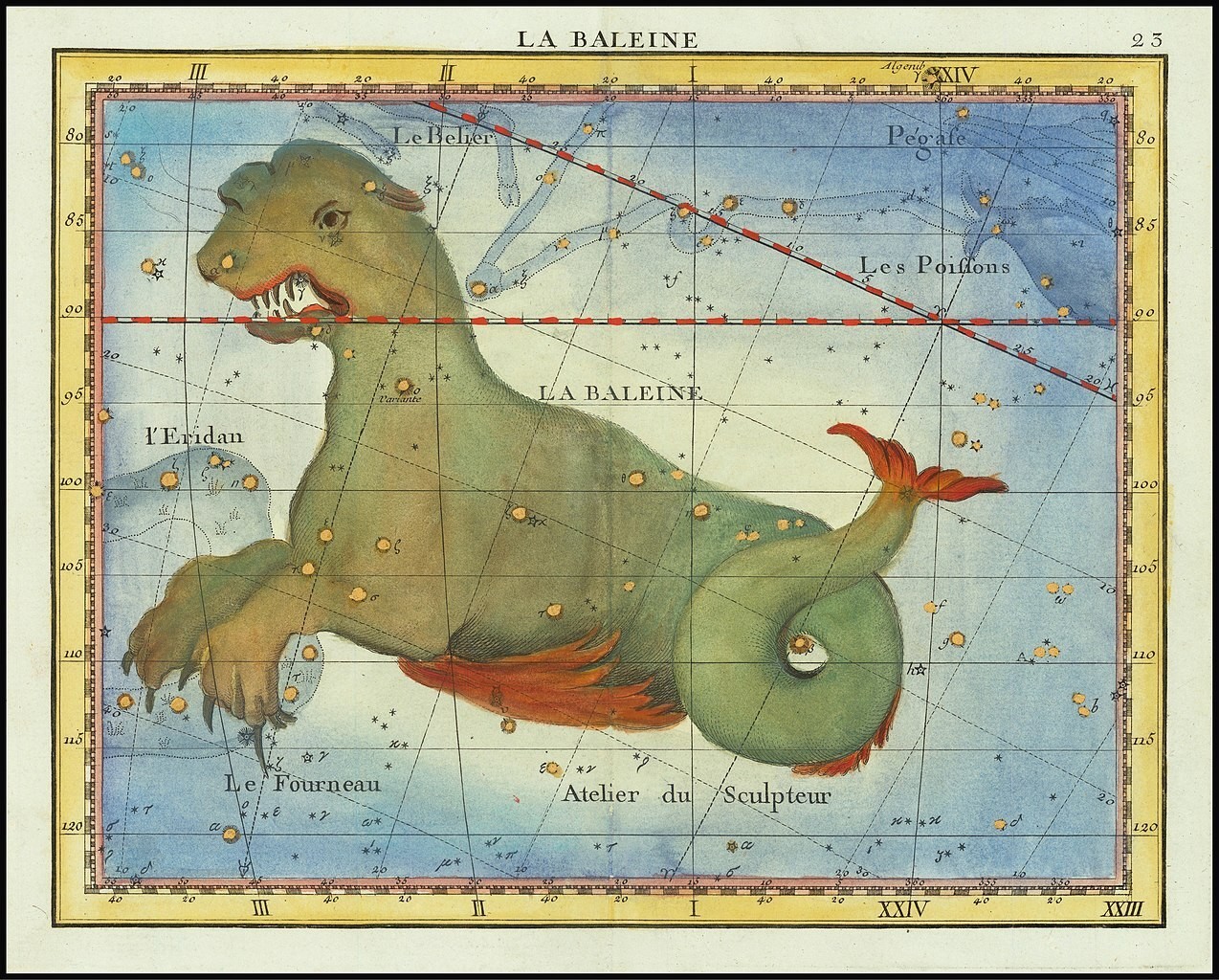 A 17. században Johann Bayer „sárkányhalként” jelenítette meg, Willem Blaeu holland térképész és Andreas Cellarius holland–német térképész ugyanebben a században bálnaszerű lényként örökítette meg. A Sidney Hall-féle Urania’s Mirror nevű csillagkép-kártyák egyikén a szörny társaságában feltűnik még néhány dolog: az egyik a Psalterium Georgii (György hárfája) nevű aszterizmus, amelyet III. György brit uralkodónak hódolva alkotta meg Hell Miksa 1789-ben. Ma már nincs használatban. Egy másik alakzat, amit felfedezhetünk a kártyán, a Fornax Chemica (Vegyi kemence), amely ma már csak Fornax néven ismert. Továbbá 1800-ban Johann Bode rajzolta meg a Machina Electricát, ma már ez sem létezik. 1752-ben Nicholas Louis de Lacaille francia csillagász az égre álmodta az Officina Sculptoris (Szobrászműhely) csillagképet, amelyre ma csak Sculptor (Szobrász) csillagképként hivatkozunk.