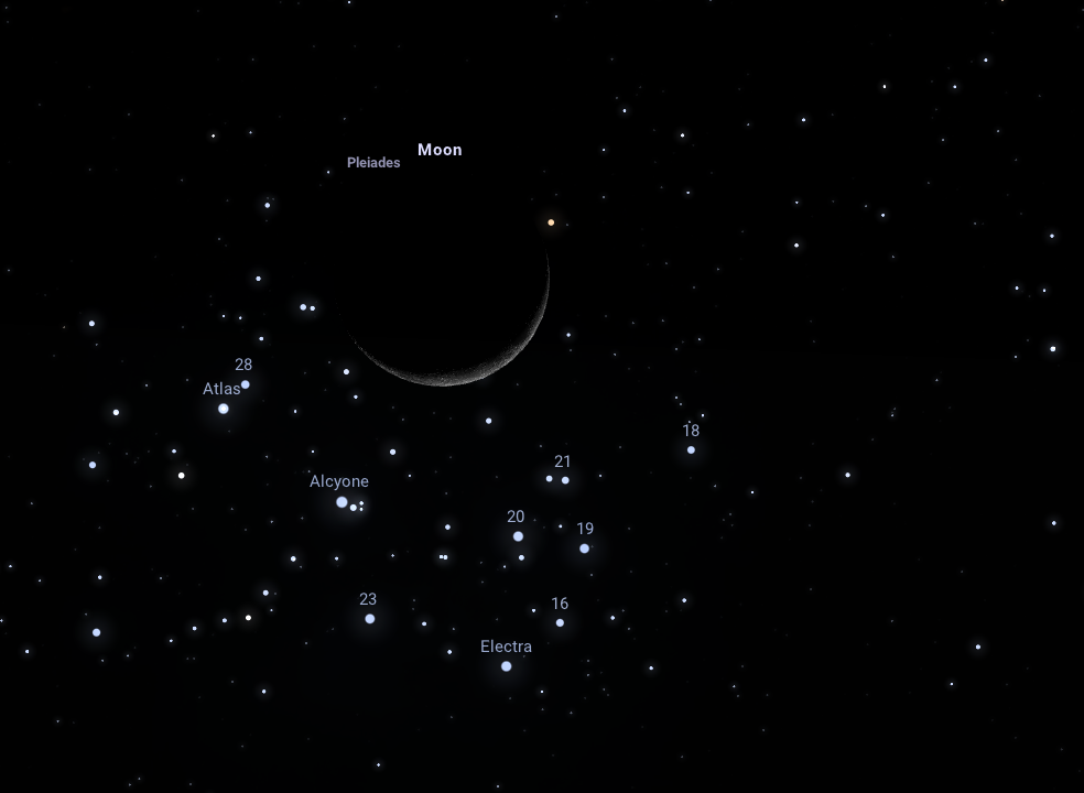 Talán akkor a legizgalmasabb a holdészlelés, amikor vékonyka sarlója éppen az újhold állapota előtt vagy után alig-alig sejlik fel a szürkületi égen. Ilyenkor nehezen vehetjük észre szabad szemmel, így nem olyan egyszerű megkeresni, mint a telihold állapotában. Április 18-án, szombaton szerencsésnek mondhatjuk magunkat, mert a vékony holdsarló éppen a Vénusz közelségében látszik majd az esti égen, naplemente után. Másnap a Hold és a Vénusz párosához csatlakozik a legismertebb nyílthalmaz, a Fiastyúk is: az M45-ös számmal jelölt Messier objektum bizonyos csillagait el is fedi a Hold ezen az estén. Mind szabad szemes, mind távcsöves észlelőknek ajánljuk ezen érdekes égi jelenségek megfigyelését.