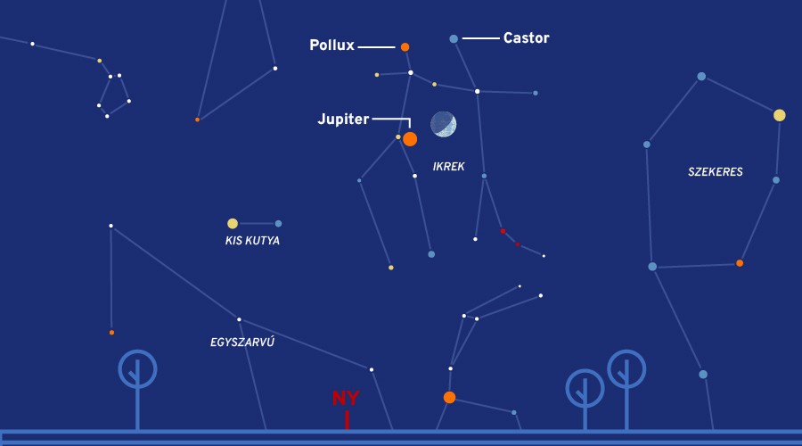 Április 22-e nem csak a Lyridák maximumával örvendeztet meg minket, de este 11 órakor egy nagyon szép, négyes együttállást is megfigyelhetünk. A jelenleg az Ikrek csillagképben tartózkodó Jupitert 3,1°-ra közelíti meg a 35%-os növekvő fázisú Hold. A párostól nem messze látszik a csillagkép két legfényesebb csillaga, a Pollux és Castor. A négyest nyugat felé kell keresni, nagyjából 26 fok magasan. Érdemes már korábban elkezdeni az észlelést és megfigyelni, ahogy a Hold egyre közelebb kerül a bolygóhoz. Az együttállás szabad szemmel a leglátványosabb, de ha szeretnénk ezeket az égitesteket távcsövön keresztül is szemlélni, akkor erre az alkalomra érdemes a Svábhegyi Csillagvizsgálóba látogatni. A program itt található.