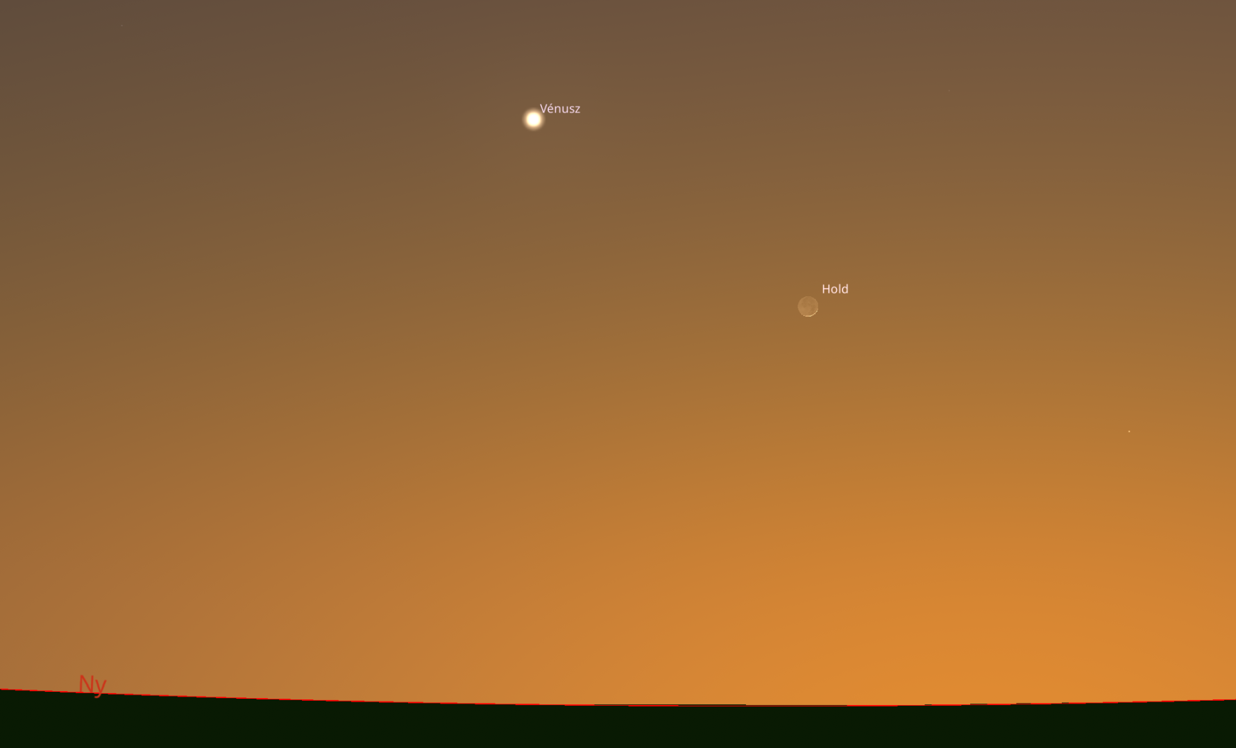 A Hold és a Vénusz együttállása: ezen a szombati estén 20:10-kor, a polgári szürkület végén közel látszik a rendkívül vékony, 2%-os és mindössze 30 óra 18 perces holdsarló és az Esthajnalcsillag, a Vénusz. Ezúttal a Vénuszt egyszerűbb lesz észrevenni, mint a máskor oly fényes Holdat, így érdemes először azt megkeresni 16 fokkal a látóhatár felett. A Hold halovány sarlója jobbra lefelé látszik majd a Vénusztól, mégpedig 11 fokos magasságban. Mivel a két égitest egymástól 8,8 fokos távolságban lesznek, az együttállás lazának mondható, megfigyelése azonban érdekes lehet korán fekvőknek vagy gyerekeknek is a kedvező időpontot tekintve.