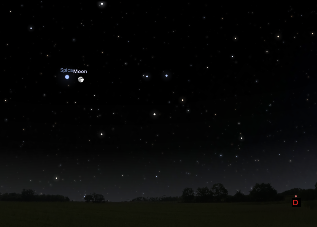 A Hold és a Spica együttállása: este 23:00-kor laza együttállásba lép a 97%-os fázisú Hold és a Spica csillag mégpedig olyan módon, hogy a Szűz csillagkép legfényesebb csillaga a Holdtól balra, 5,3 fokos távolságban látszik majd, 31 fokkal a látóhatár felett.