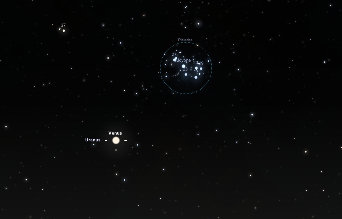 Este 21:00-kor következik be a két bolygó közelségének pillanata, amikor is érdemes olyan helyet keresni az észleléshez, ahonnan jól látszik a nyugati horizont. A látóhatár felett 9,5 fokkal láthatjuk ugyanis a Vénuszt, amely mellett mindössze 49'-re látszik az 5,8 magnitúdós Uránusz, attól balra lefelé. Sikerélményt adhat a kezdő észlelőknek is, ha megpillantják binokulárjuk lencséjén át az Uránuszt, ám ha még tovább fűszereznék ezt az egyébként is érdekes együttállást, érdemes megkeresniük a közelben látható Fiastyúkot is.