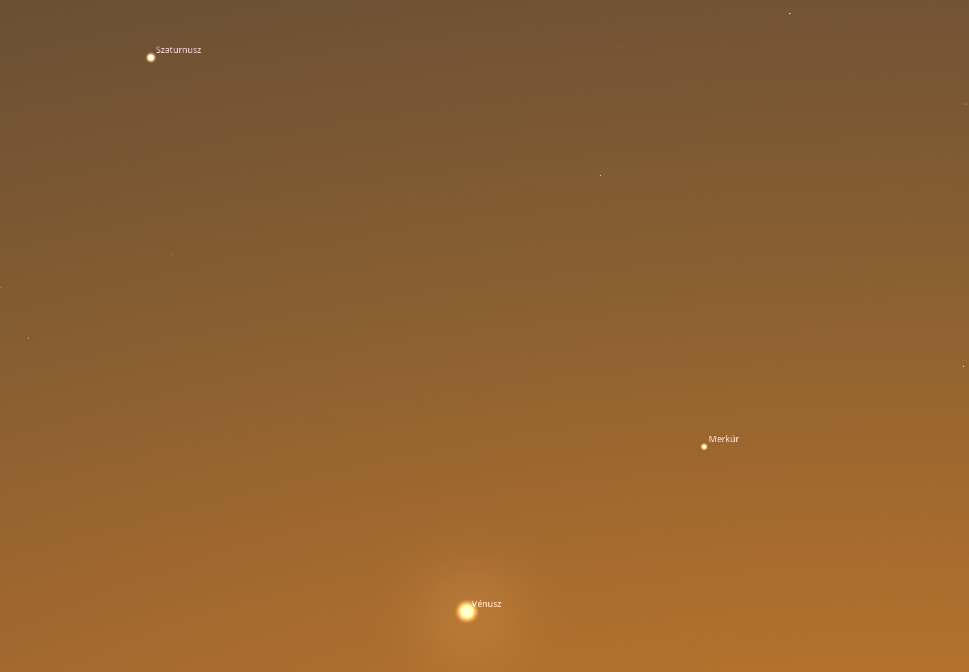 17:57-kor következik be a Merkúr és a Vénusz együttállása, amikor a két bolygó kis szögtávolságra látszik egymástól az alkonyi égen. A Merkúr ekkor már a láthatóság végéhez közeledik: a polgári szürkület végén mindössze körülbelül 7°-os magasságban helyezkedik el a nyugati horizont felett. Megvilágítottsága csupán 15%, vagyis a bolygó vékony sarló alakban látszik. Ez a fázis annak a következménye, hogy a Merkúr gyorsan közeledik az alsó együttálláshoz, amikor a Nap és a Föld között halad el és a megvilágított oldala egyre inkább elfordul a földi megfigyelőtől. A kis megvilágítottság ellentéteként a Merkúr látszó átmérője 9,2 ívmásodpercre növekszik, ami a Földhöz való közelségének következménye. A méretnövekedés következtében a bolygó fényessége ekkor +1,4 magnitúdó. A látóhatárhoz közeli helyzet, a szürkületi háttérfény és a jelentős légköri extinkció miatt a Merkúr önmagában nehezen található meg, szabad szemmel biztosan nem látszik ekkor.