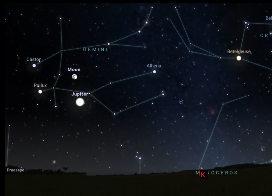 Ezen a szombati napon ugyanis este 18:00-kor a Hold az Ikrek csillagképbe érve együtt áll a Castor és a Pollux csillagokkal, illetve a szintén a közelben tartózkodó Jupiterrel. A négyesfogat csaknem paralelogramma alakzatot vesz fel, majd később, vasárnap hajnali 2:19-re L-betűvé rendeződik át. Mivel az együttállás egyik főszereplője az ekkor éppen teli állapotban lévő Hold, igazán könnyen észrevehetjük majd este a keleti, hajnalban pedig a nyugati égen. A Jupiter, illetve az együttállásban szereplő csillagok szintén megfigyelhetőek szabad szemmel, így a jelenség észlelése nem igényel távcsövet, sem binokulárt, sőt még észlelési tapasztalatot sem. Minden érdeklődőt bátorítunk tehát a Hold, a Pollux, a Castor és a Jupiter megkeresésére ezen a téli éjszakán.