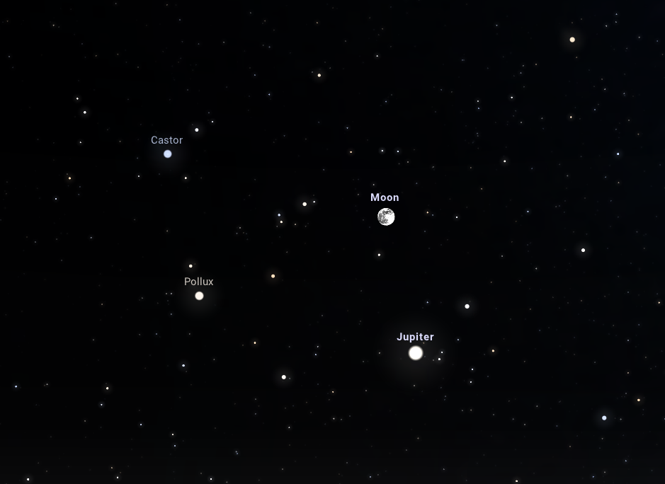Szombaton este érdemes megkeresni a teliholdat már a felkelésekor, hiszen égi kísérőnk látóhatárhoz közel önmagában is látványos. Este 18:00-kor pedig már eléggé sötét lesz ahhoz, hogy feltűnjön a 15 fokkal a horizont felett látható Hold kíséretében a keleti égen a Jupiter, a Castor, továbbá a Pollux.