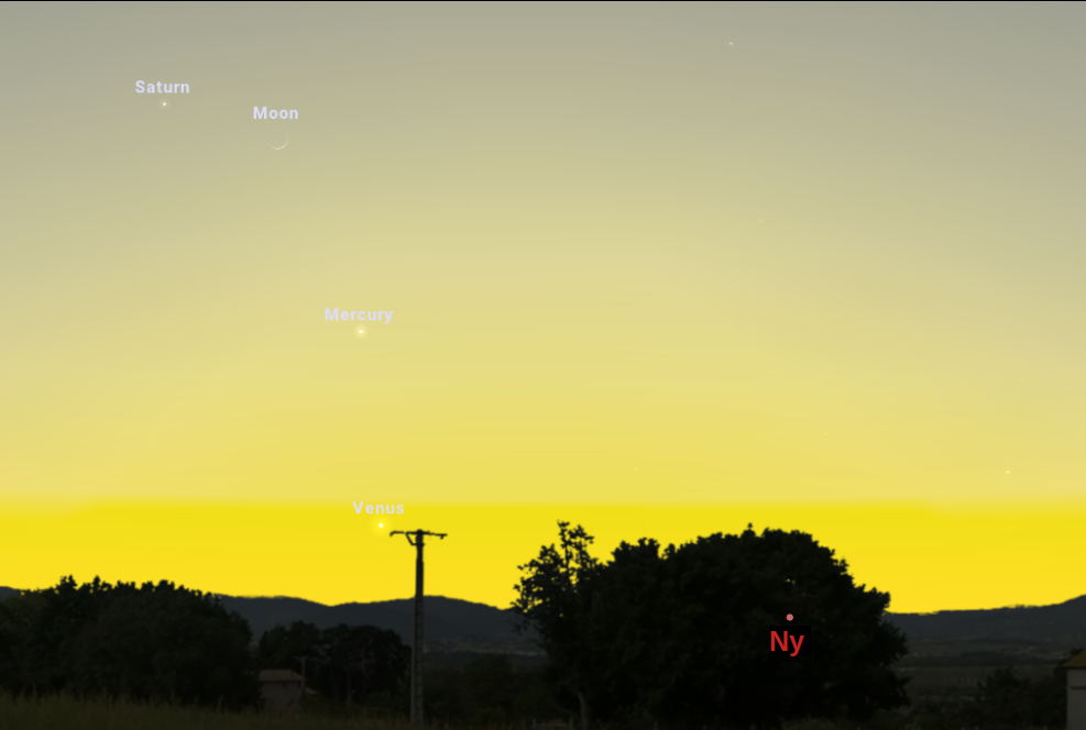 A Vénusz, a Merkúr, a Hold és a Szaturnusz együttállása: az előző napi együttállás kissé más alakzatban folytatódik. Kora este 17:45-kor az 5%-os fázisú holdsarló 18 fokos magasságban jár, és együttállásba kerül a horizont felett 3 fokkal látszó Vénusszal, a 10,7 fokos magasságban lévő Merkúrral és a 19 fokos magasságban látható Szaturnusszal. A gyűrűs bolygó a holdsarló szélétől 4,4 fokra, balra látszik majd az égen.