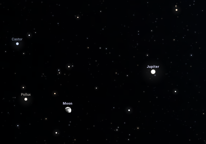 A Hold, a Jupiter, a Castor és a Pollux együttállása: este 19:00-kor a 84%-os fázisú Hold a Jupiter, valamint az Ikrek csillagkép két legfényesebb csillaga, a Pollux és a Castor közelébe kerül 59 fokkal a horizont felett.