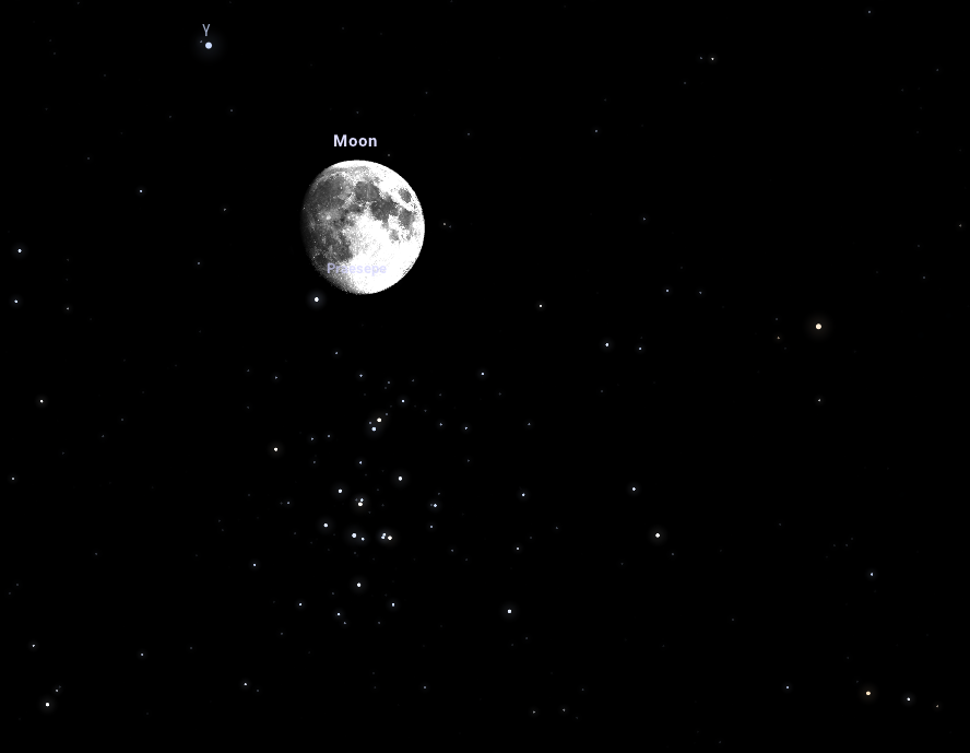 A Hold és a Praesepe szoros együttállása: este 22:00-kor a 92%-os fázisú Hold a Rák csillagképben levő Praesepe nevű nyílthalmaz közelségében látszik majd, a halmaz közepétől kb. 50'-es távolságban. Később, 23:09-kor még közelebb, mindössze 42'-es távolságban lesznek láthatók egymástól. Ugyanezen a napon 22:10-kor a 6,8 magnitúdós, HD 733871 jelű csillag belép a Hold mögé annak sötét pereménél.