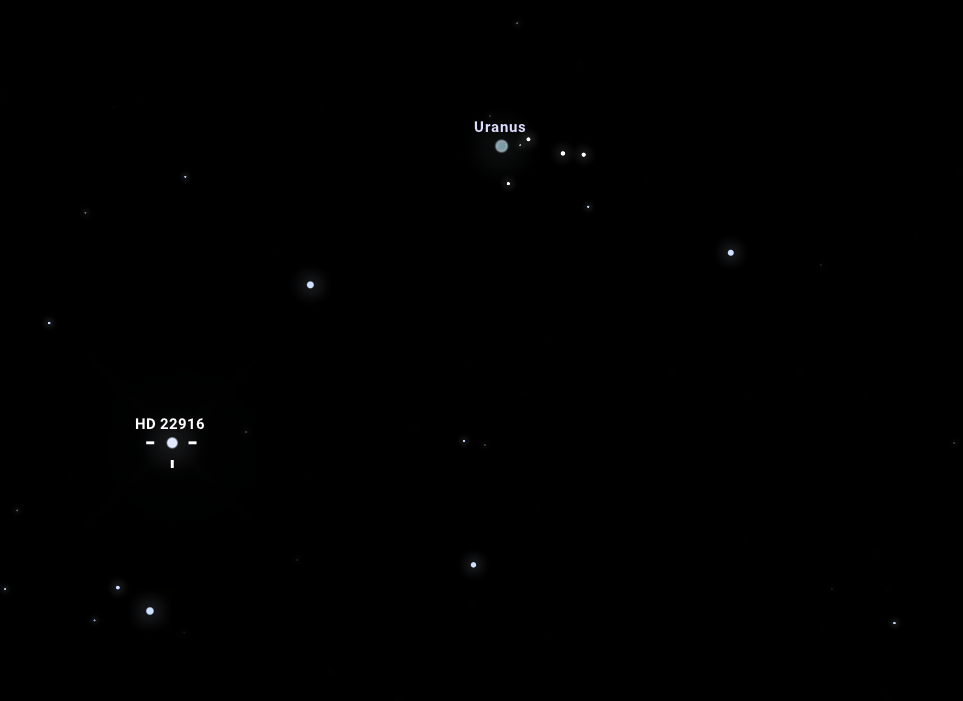 Március 9-én, hétfőn este 21:00-kor egy másik csillag kerül az Uránusz közelébe, mégpedig a 8,1 magnitúdós látszó fényességű HD 22916. A szoros együttállás résztvevői nagyjából 3,5'-re látszanak egymástól: a csillag a bolygótól balra lefelé keresendő. Ekkor az Uránusz a nyugati látóhatár felett 27 fokos magasságban lesz az égen.
