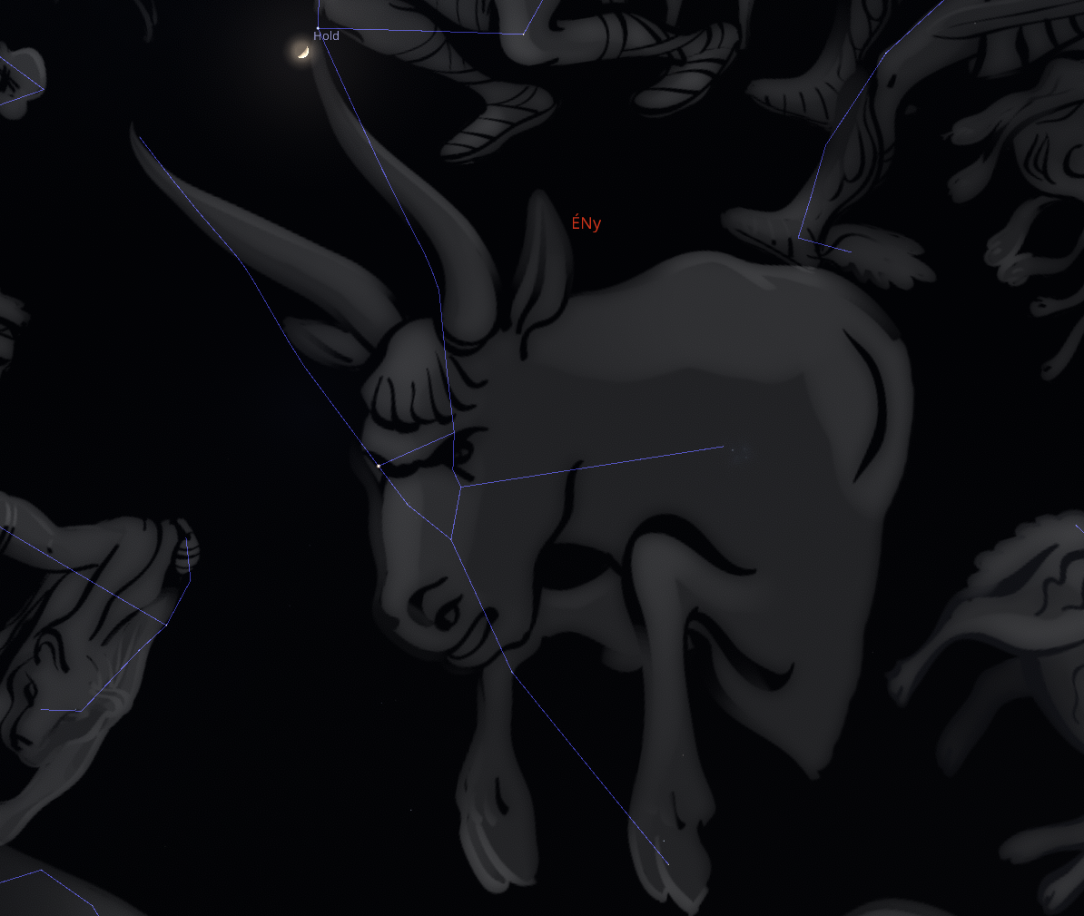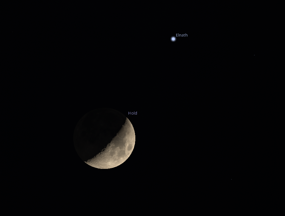 a növekvő, 39%-os megvilágítású holdsarló szoros együttállásban látszik majd az Elnath csillaggal. A jelenség 22 óra körül már jól megfigyelhető lesz a délnyugati égbolton, amikor a Hold mintegy 29° magasságban tartózkodik. Ekkor az 1,7 magnitúdós fényességű Elnath körülbelül 1,6°-kal a holdsarló fölött látszik majd. Ez a távolság (három látszó holdátmérő) az égbolton viszonylag kicsinek számít, így a két égitest feltűnően közel jelenik meg egymás mellett.