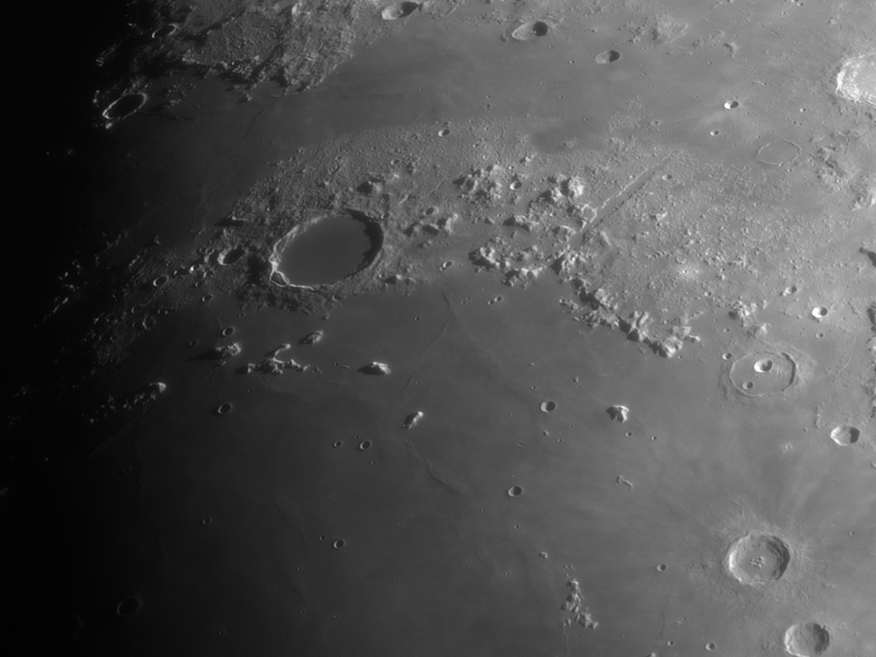 A Hold északi, felső féltekéjén található a Plato-kráter, amely 3,8-3,2 milliárd évvel ezelőtt keletkezett. A 101 km átmérőjű felszíni képződmény aljzata fekete bazaltlávával van feltöltve, amelyen a kráter peremének az árnyékát is megfigyelhetjük. A kráter körül a holdi Alpokot láthatjuk (Montes Alpes), amely 250 kilométer hosszan húzódik égi kísérőnk felszínén, és hegycsúcsai 2-3 kilométer magasak.