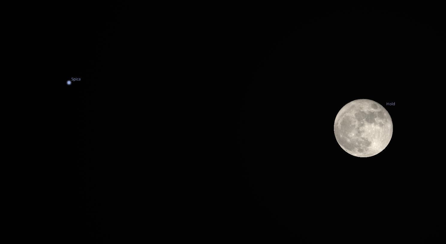 Az este folyamán a majdnem teljesen megvilágított (99%-os) Hold szoros együttállásban lesz majd látható a Szűz csillagkép legfényesebb csillagával, a Spicával. A csillagot ekkor a Holdtól balra, mintegy 2,3 fokos távolságban találjuk meg. A Spica fényes, kékesfehér színű csillag, azonban a közel telihold erős ragyogása miatt kissé halványabbnak tűnhet, így megpillantása némi odafigyelést igényel. A jelenség különlegessége, hogy a Hold szinte teljes korongja világítja be az eget, így a kontraszt kisebb, mint kisebb holdfázisok idején.