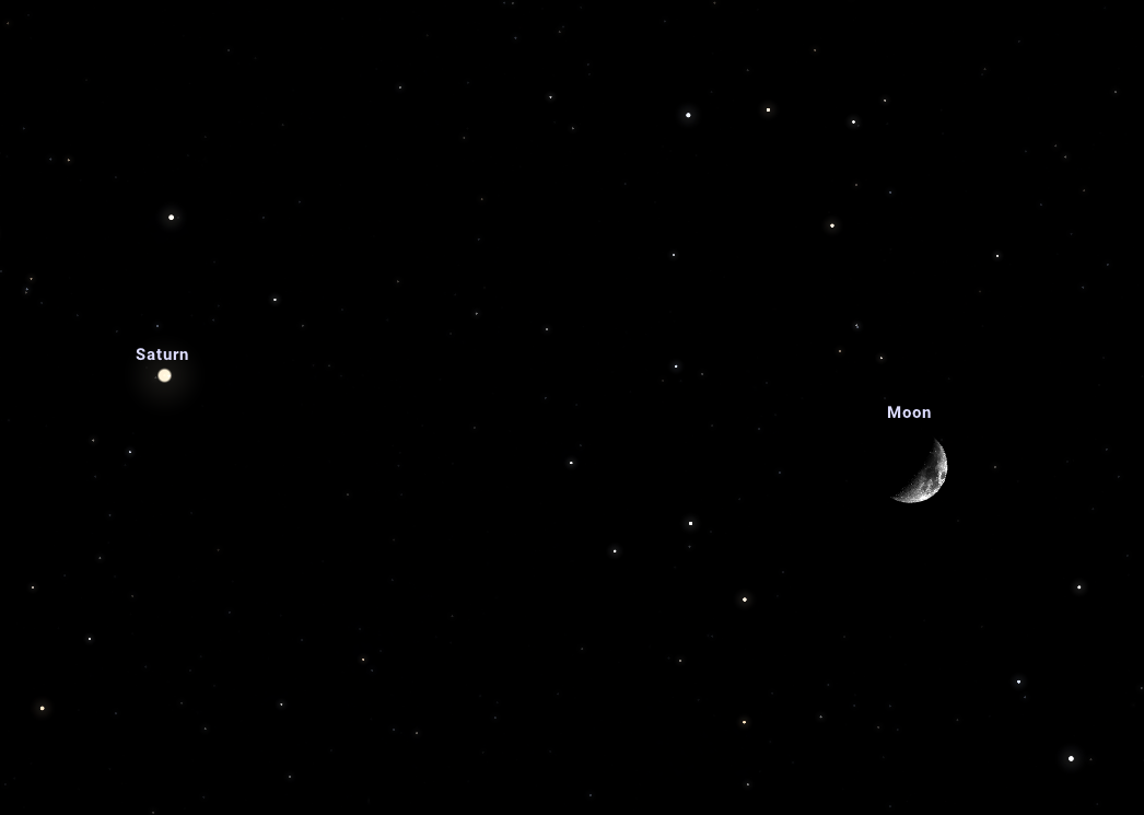 A Hold mellett balra fénylik az 1,0 magnitúdós Szaturnusz, kiemelkedve a környező csillagok közül. A Szaturnuszt is érdemes binokulárral, méginkább távcsővel is megnézni, hiszen ez a leglátványosabb, ezért legnépszerűbb és leginkább kedvelt bolygó.